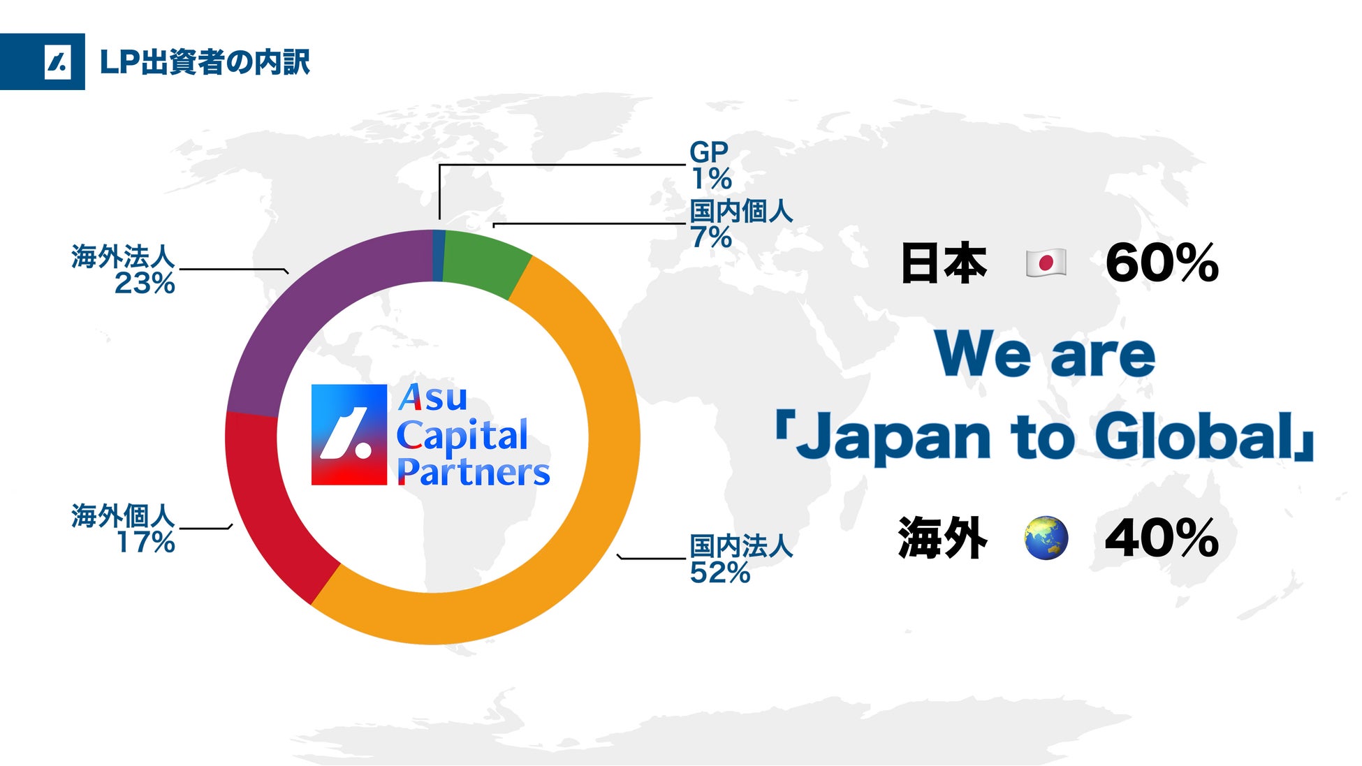 そして、“Japan to Global”を掲げるファンドとして、自らも“Global”であることを体現すべく、出資者(LP)の約40%が海外投資家となっています。
