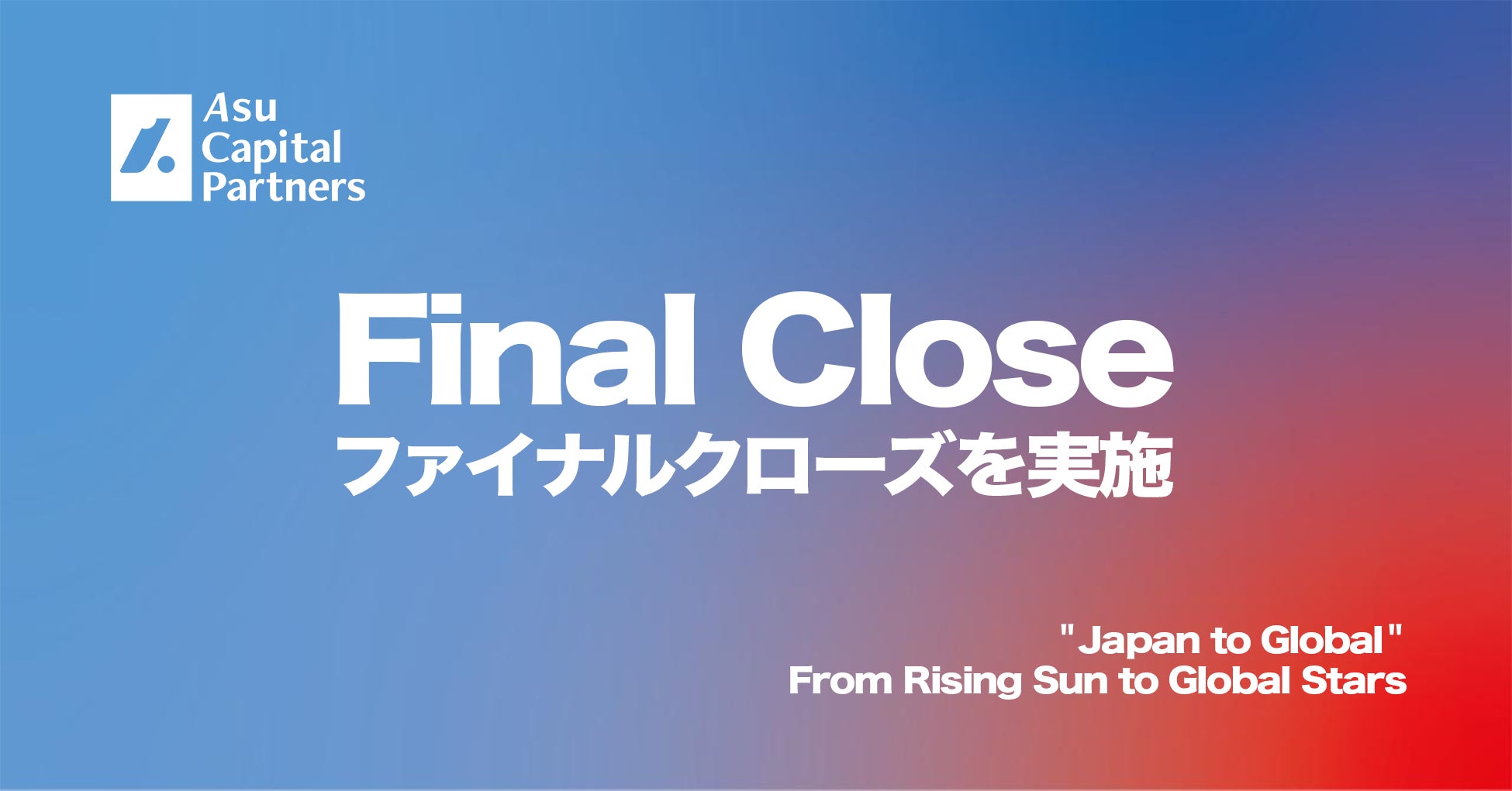 私たちAsu Capital Partnersは、“Japan to Global”というビジョンのもと、領域を問わず、日本発のグローバルスタンダードを目指す事業・チームにこれからも全力でご支援していきたいと思います。