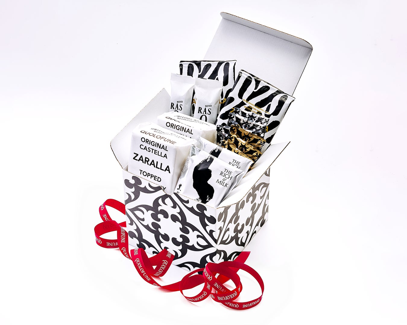 リボンをほどけば、夢いっぱいの商品が詰まった「Q-CUBE」は、大人気商品のざらめをふんだんにトッピングしたザラーラや、チョコレートをたっぷりまとったカステララスクのノボラスキュなど、たくさんのお菓子をお詰めしました。贈り物にはもちろん、家族でのパーテイーにも。
