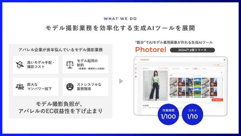 Photorelはアパレルのモデル撮影業務の効率化を実現すべく、AIモデルの着用画像を瞬時に作成できる画像生成AIサービスです。アパレル企業様は洋服の平置き画像を準備するだけで、AIがモデルの骨格・体形に合わせて自動でフィットする形で洋服試着してくれます。モデル撮影のリソース・コスト負担や、モデル手配のハードルを解消し、アパレルECの運営効率を高めることを目指します。