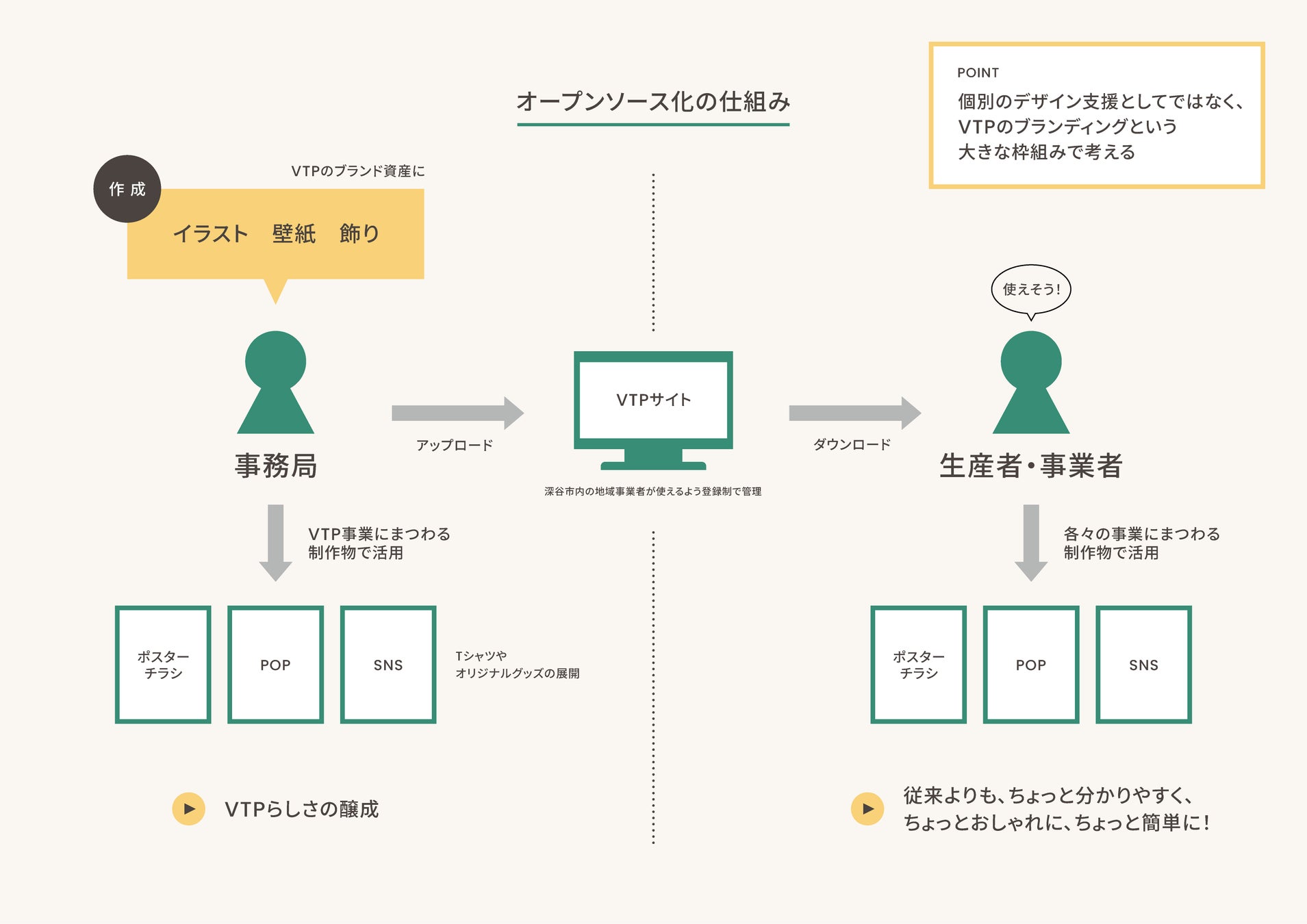 本プロジェクトで作成したイラストは、深谷市の観光回遊促進メディア「ベジタブルテーマパークフカヤ」(以下、VTPメディア)の専用ページから、必要情報を登録することで、ダウンロードして利用することが可能です。また、オンライン上のイラスト素材提供だけではなく、イラストの利用促進を行うことが肝要なため、深谷市内のオフライン拠点である「RELOCA BASE」を拠点にイラストを活用したデザイン支援を試験的に実施しました。