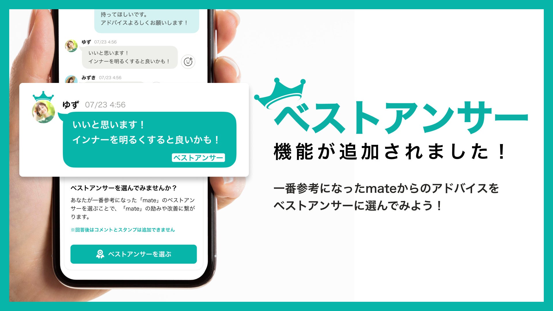 この新機能により、相談者はベストアンサーを基に自分のファッションを改善でき、mateはベストアンサーに選ばれることでどのようなアドバイスが相談者にとって有益であるかを理解し、今後のコメントの質を向上させるための指針となります。
