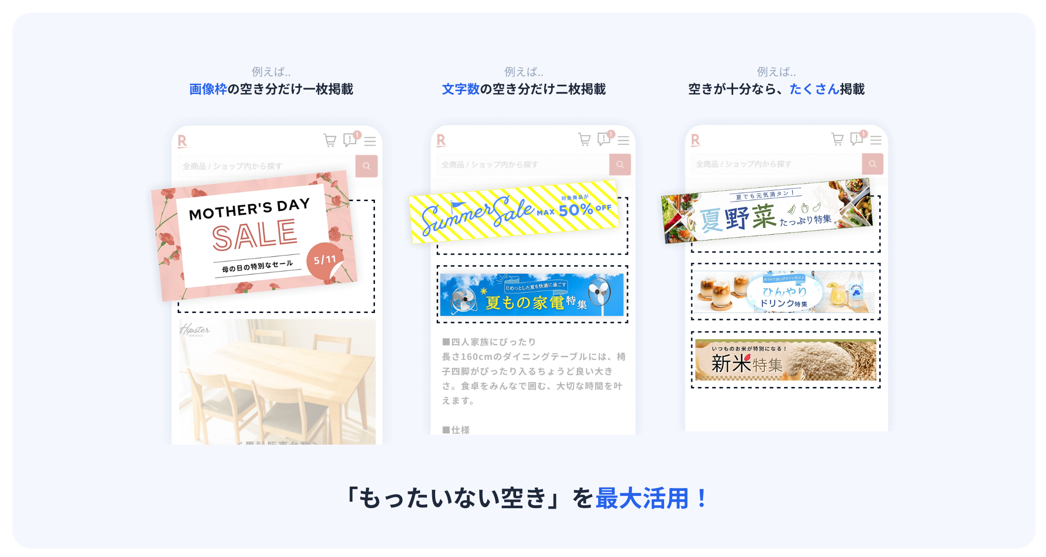 「楽天スーパーSALE」や「お買い物マラソン」の開始・終了、さらには店舗独自の企画セールや季節・商戦に合わせた販促まで、楽天市場のあらゆるタイミングに合わせたバナー更新をすべて予約可能。
