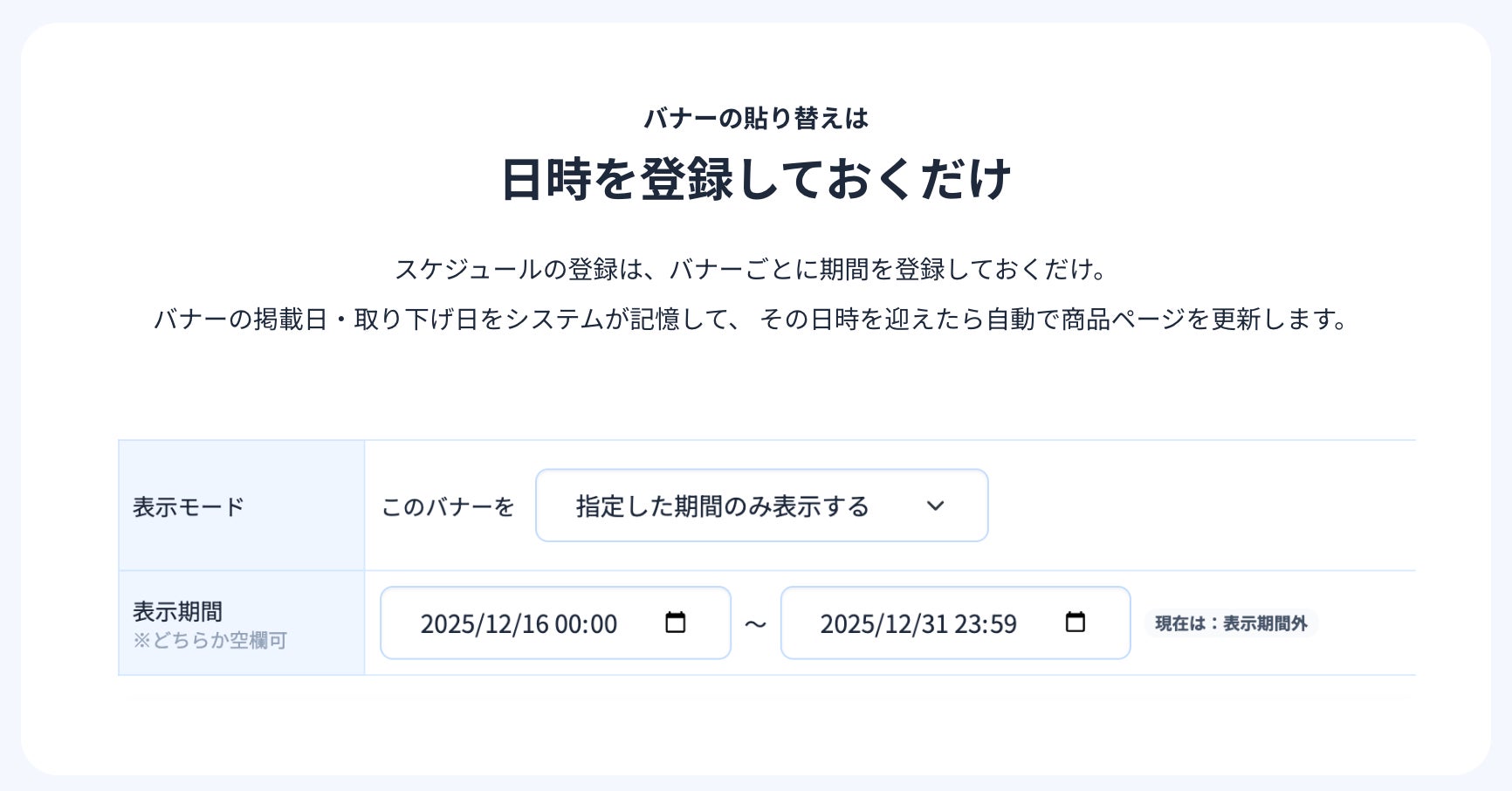 「バナー画像」「対象商品」「掲載期間」を指定するだけの3ステップで、誰でもすぐにバナー運用を開始できます。