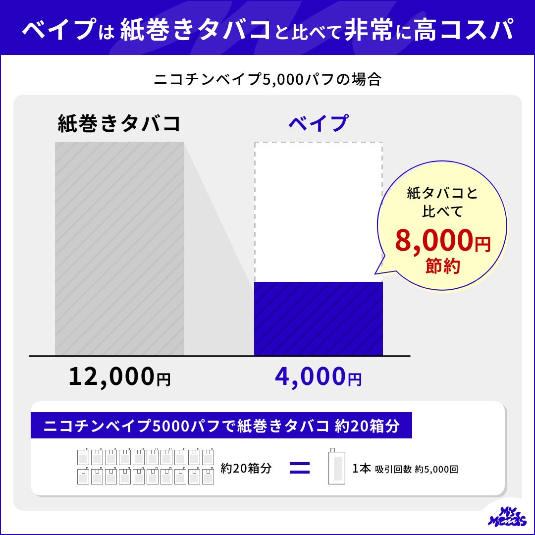 MyMoods VAPEは他社製品(ニコチンベイプ)と比較しても、1,000円以上コスパが良く、紙巻きタバコと比較すると、月あたり8,000円の節約になります。