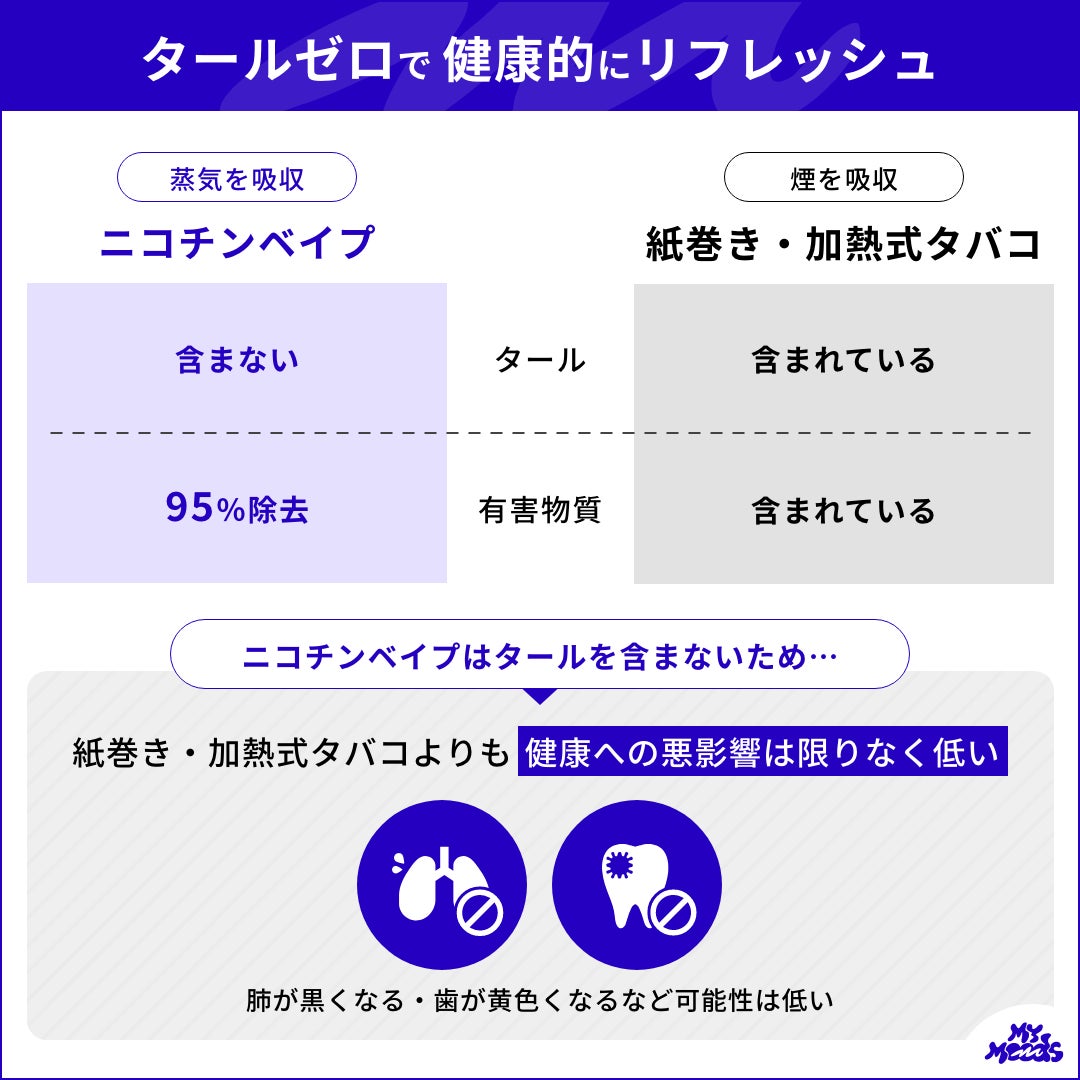 ニコチンベイプには、紙巻きタバコ・加熱式タバコに含まれているタールが、一切含まれておりません。そのため、肺が黒くなる、歯や家の壁が黄色くなるなどのリスクも防ぐことが可能です。