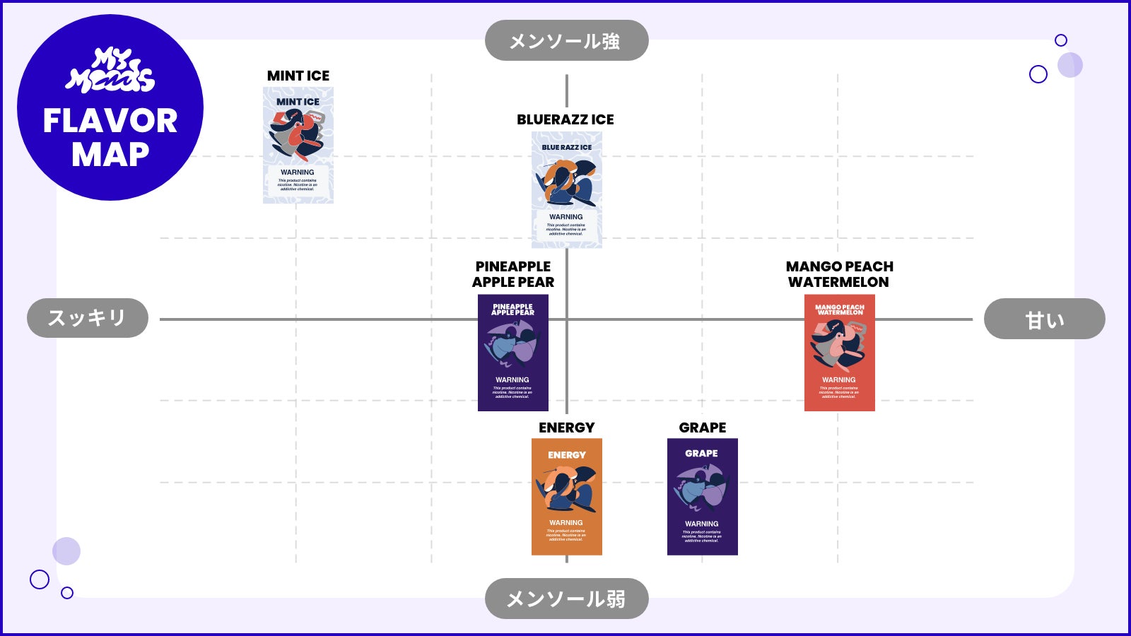 メンソールの強弱や、甘さ・スッキリなど、各フレーバーのテイストがひと目でわかるものとなっておりますので、ぜひフレーバーを選択される際は、ご参考になさってください。