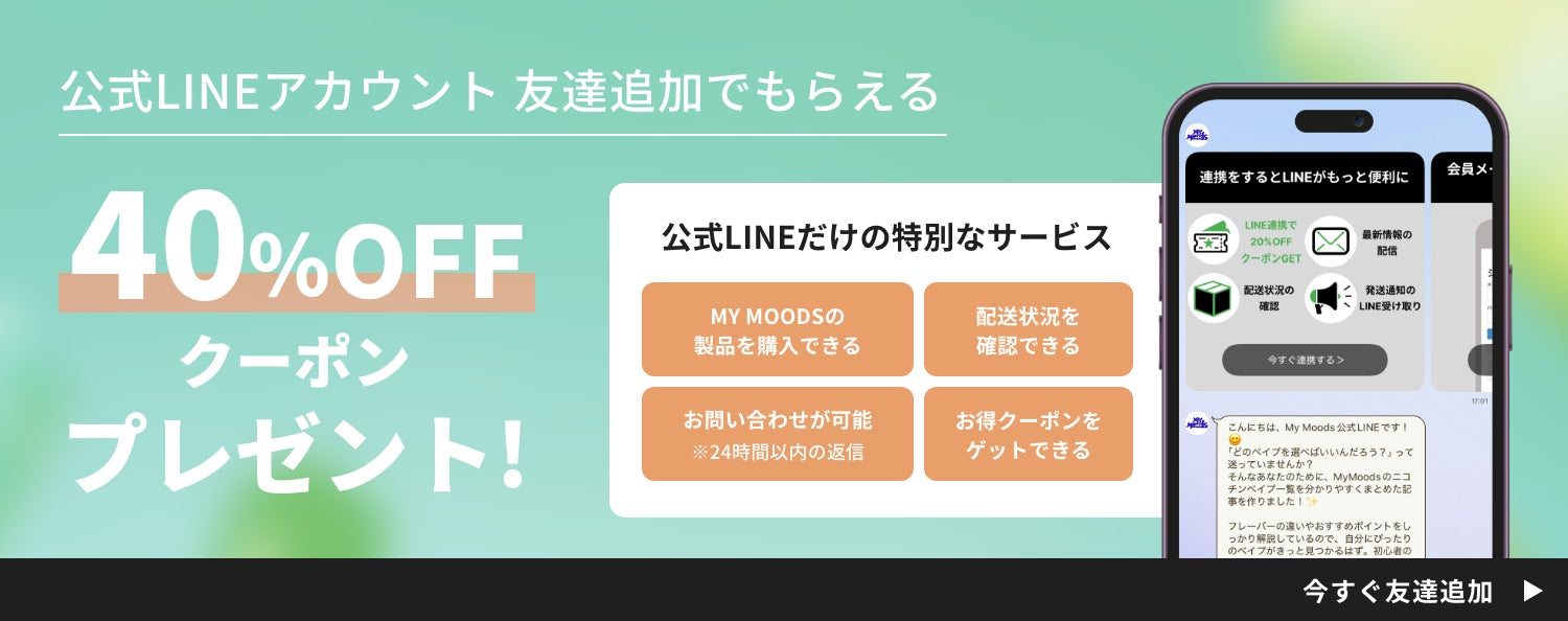 2025年2月より新発売となったMyMoods VAPEは、デバイス・フレーバーともに自社開発を行った商品です。そのため、中間コストを削減し、他社製品よりも高コスパ・高クオリティの製品を安価に皆様にお届けすることが可能です。