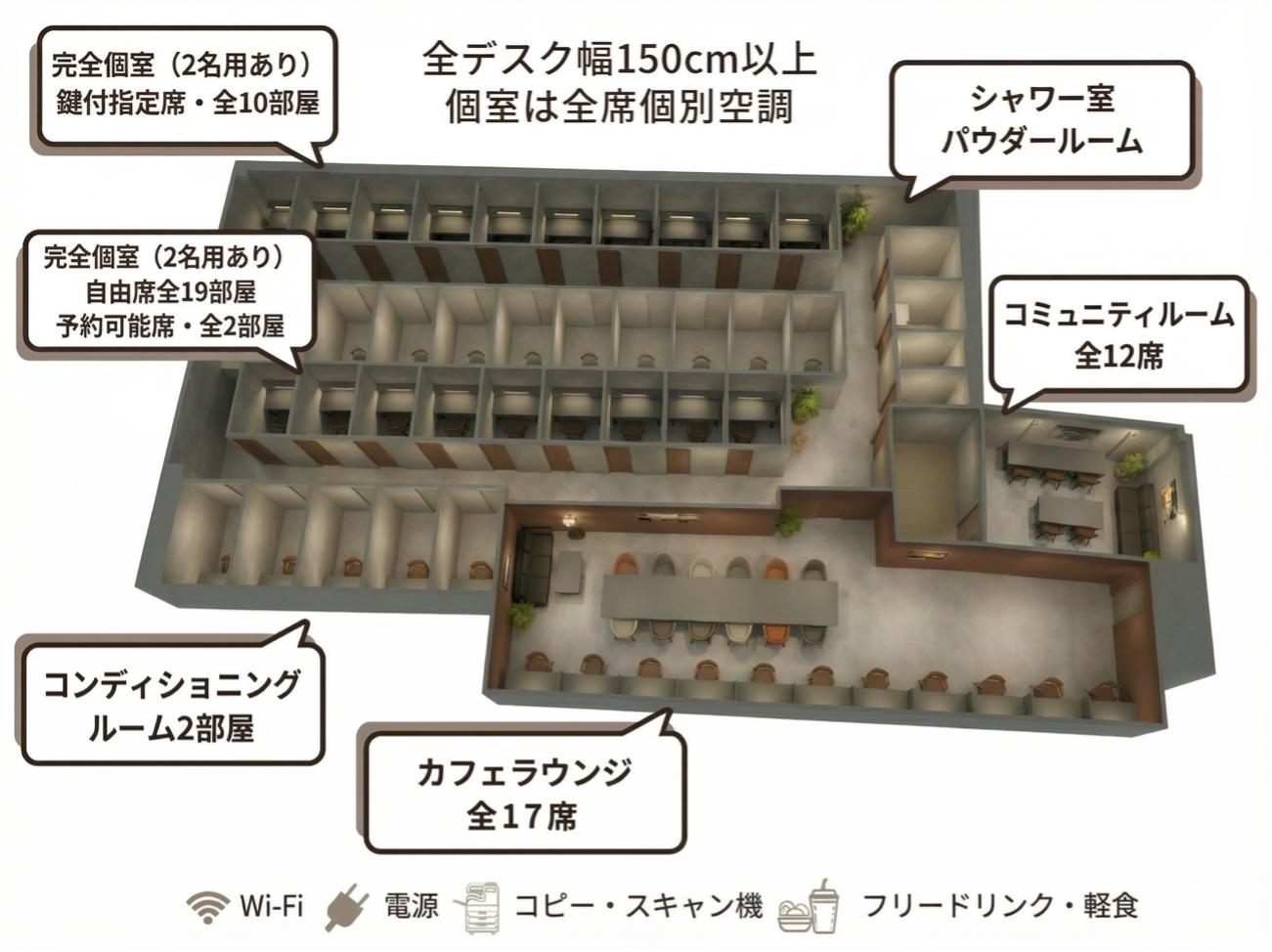 豆から挽くコーヒー等のドリンクやデニッシュなどの軽食を無料で提供し、集中力の持続を後押しします。さらに、無料のシャワー室、パウダールーム、マッサージチェア等を備えたコンディショニングルーム、複合機(スキャン・カラーコピー可)、学びと仕事を「無理なく継続する」設備をワンフロアに集約しています。