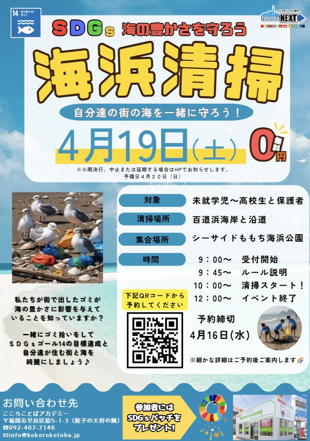 株式会社こころことばアカデミー(本社・福岡市、代表取締役・稲員諒翔)は、SDGs14番「海の豊かさを守ろう」をテーマに、スクールの拠点を置く福岡市早良区のシンボルである「ももち浜海浜清掃」を実施します。未来にまできれいな海を残したいという子ども達の願いを叶えるべく、ごみを拾うイベントとなります。