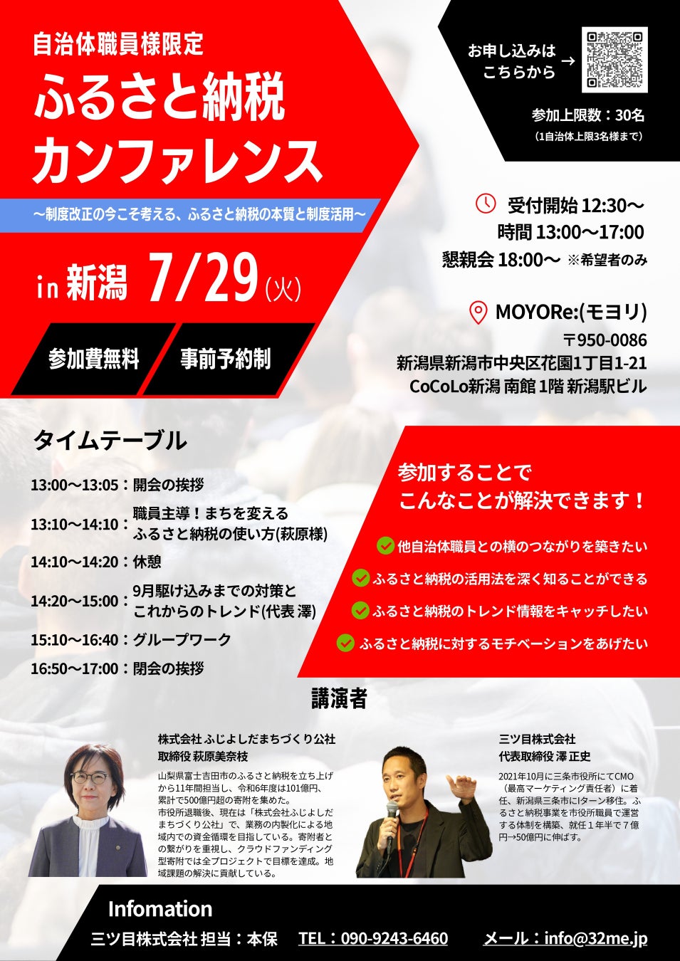 三ツ目株式会社(本社:新潟県三条市 代表取締役:澤 正史、以下「三ツ目」)は、2025年7月29日(火)、新潟県内の市町村職員を対象とした「ふるさと納税カンファレンスin 新潟」を開催いたします。