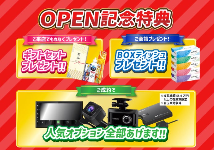 今回、11/15(土)~11/30(日)の新店オープンフェア期間中にご来店いただいたお客様に多数の特典をご準備しております。内容に関しましては下記をご確認下さい!