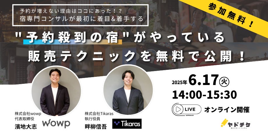このたび、10,000円から始められる宿泊施設専門のスポットコンサルティングサービス『ヤドチケ』を運営する株式会社Tikarasと株式会社wowpとが共同で「【人手も時間も足りない宿必見!】予約が増えない理由はココにあった!?コンサルが最初に着目&着手する"予約殺到の宿"がやっている㊙︎テクニックを無料で公開!」を開催します。