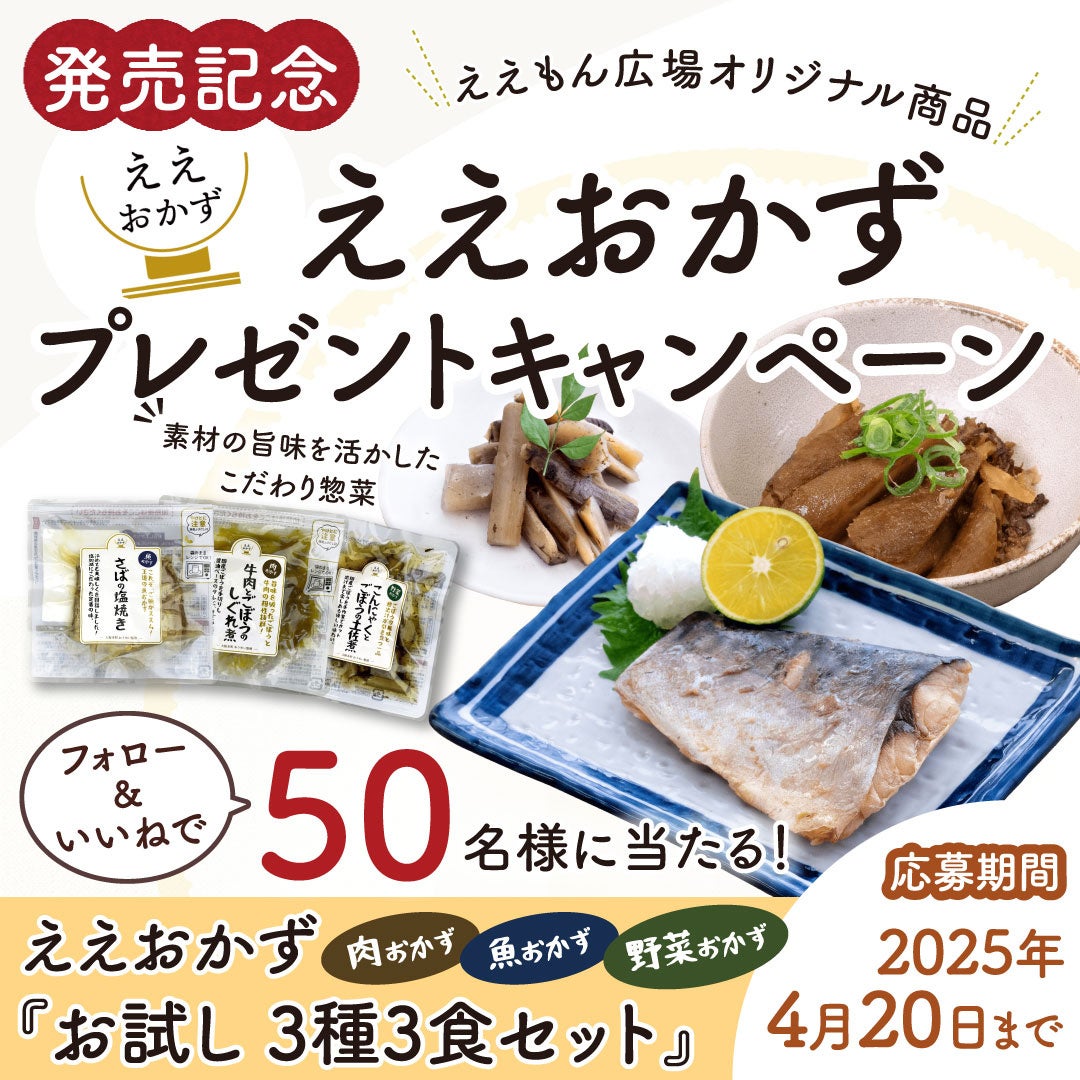 抽選で50名様に「ええおかず お試し 3種3食セット」をプレゼント。