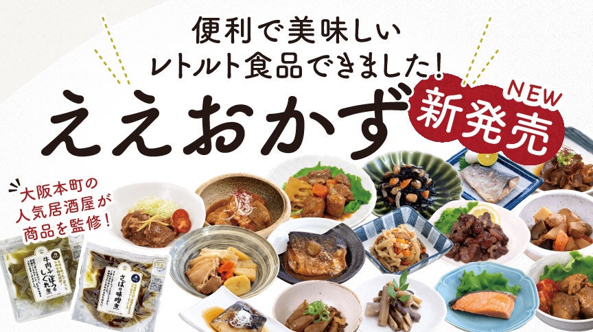 常温保存可能なレトルト惣菜『ええおかず』、オンラインショップ「ええもん広場」で新発売。飲食店監修のもと、牛すじ煮込みなどの肉惣菜・さばの煮つけなどの魚惣菜・筑前煮などの野菜惣菜を、全16種類でご用意