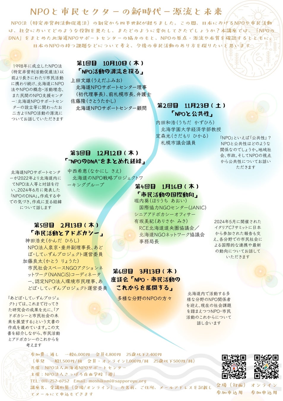 NPO法人さっぽろ自由学校「遊」との共催で、10月10日(木)より全6回の講座「NPOと市民セクターの新時代ー源流と未来」を開催します。NPO(特定非営利活動促進法)の制定から四半世紀が経ち、日本におけるNPOや市民活動は社会においてどのような役割を果たし、どのように変化してきたでしょうか。2022年より当センターグループが開始した「北海道の戦略プロジェクト」そして、2024年6月に発表した「NPOのDNA」。ゲストの方のお話を聴きながら、参加者のあなたと対話したく、この講座を開きます。ぜひご参加ください!