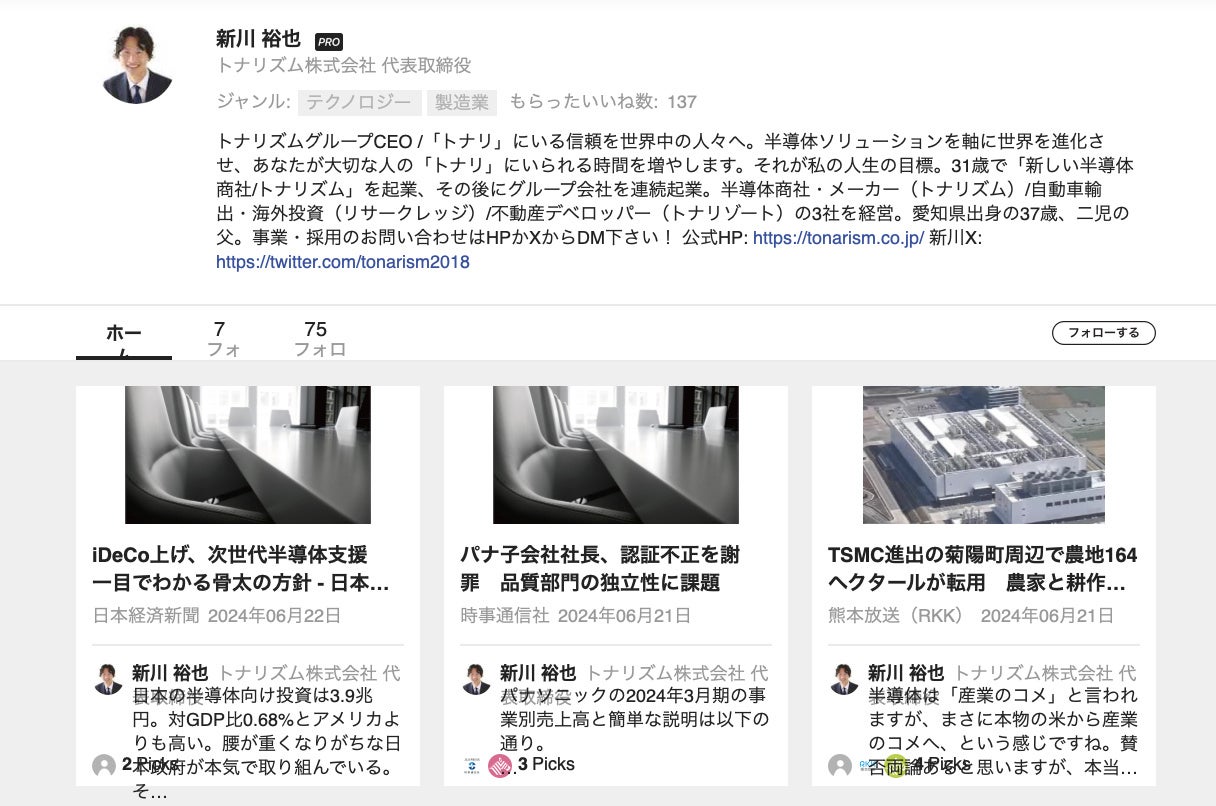 NewsPicksのプロピッカーに就任 半導体商社トナリズム代表の新川が、独自の視点でニュースを読み解きます。