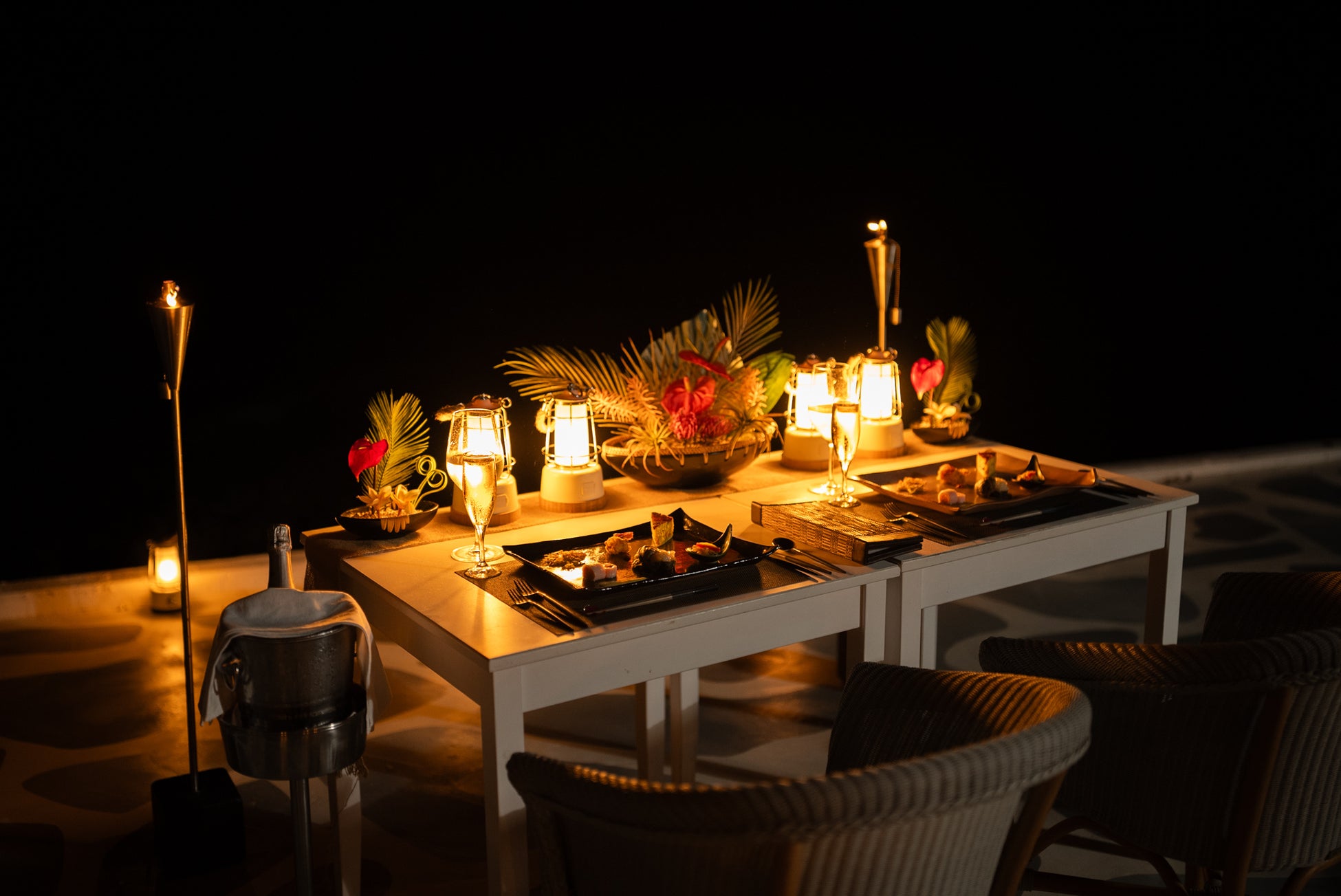 ご好評につき、冬季限定から通年開催へと進化した「プレミアムディナー」。1日1組限定の特別な体験として、海辺のオーシャンフロントテラスや屋上テラスで、与論島や鹿児島県産の食材を使ったフルコースをお楽しみいただけます。サンセットから星空へと移り変わる空の下、星のソムリエによるガイドとともに、忘れられない夜をお過ごしください。