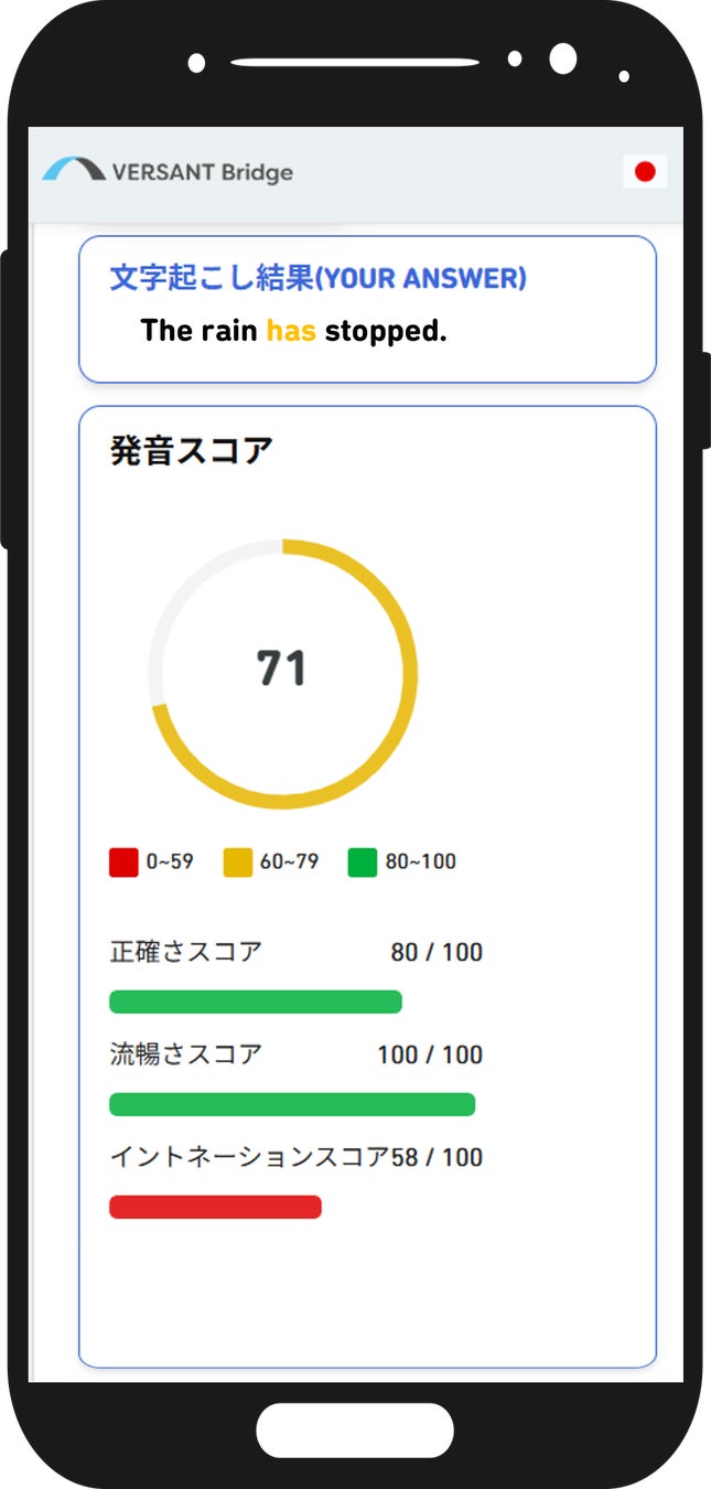 近年、英語スピーキング能力を客観的に測定するVersantの需要が高まる一方で、安価かつ効果的にスピーキング力を伸ばすためのトレーニングツールは限られていました。そこで弊社は、受験者が短時間で効率的に練習でき、AIによる即時フィードバックで学習のPDCAを回せるアプリとして「Versant Bridge」を開発しました。