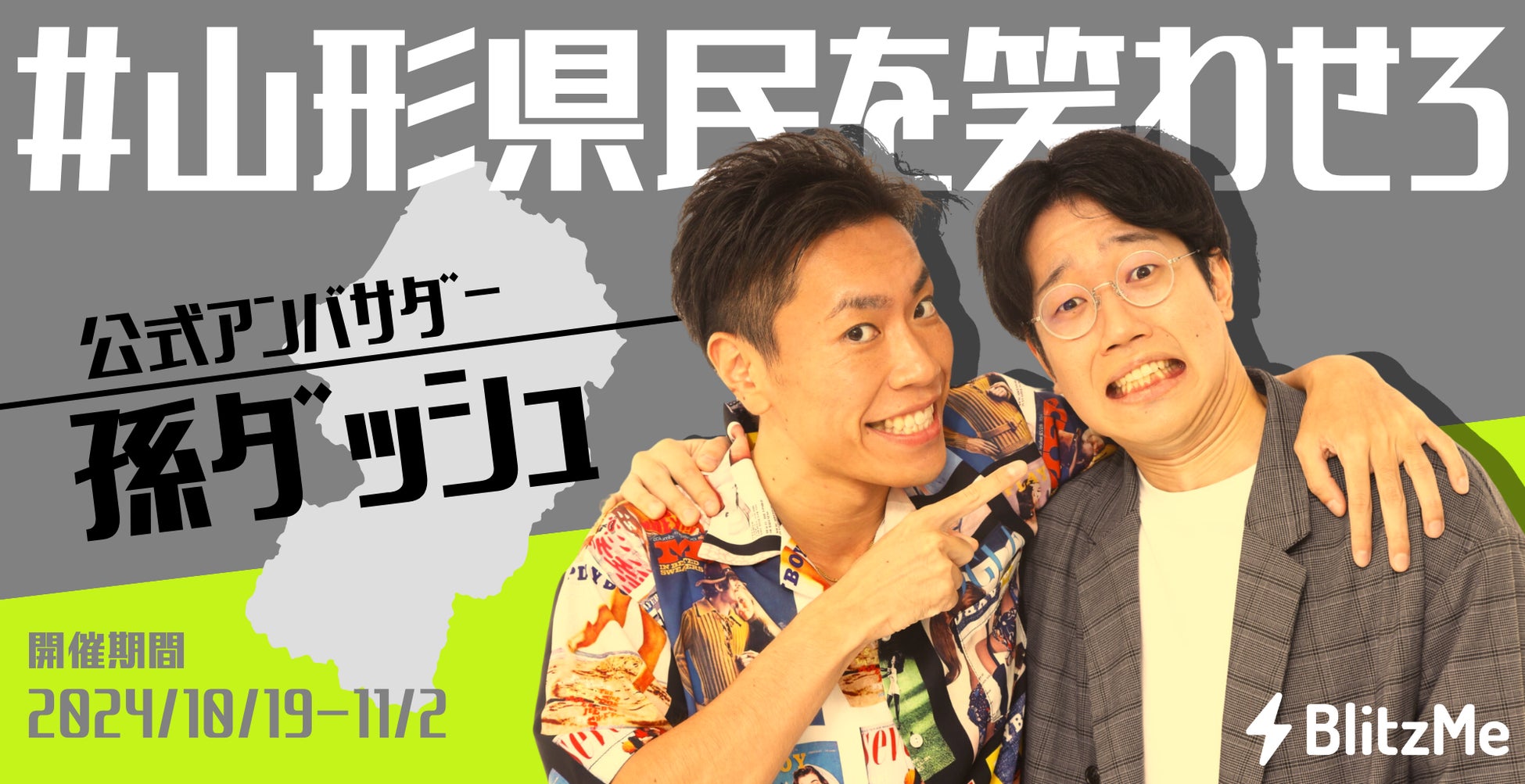 審査方法:BlitzMeアプリ内で「#山形県民を笑わせろ」とハッシュタグの付けられた投稿で最も笑いをとったコンテンツ投稿者が優勝