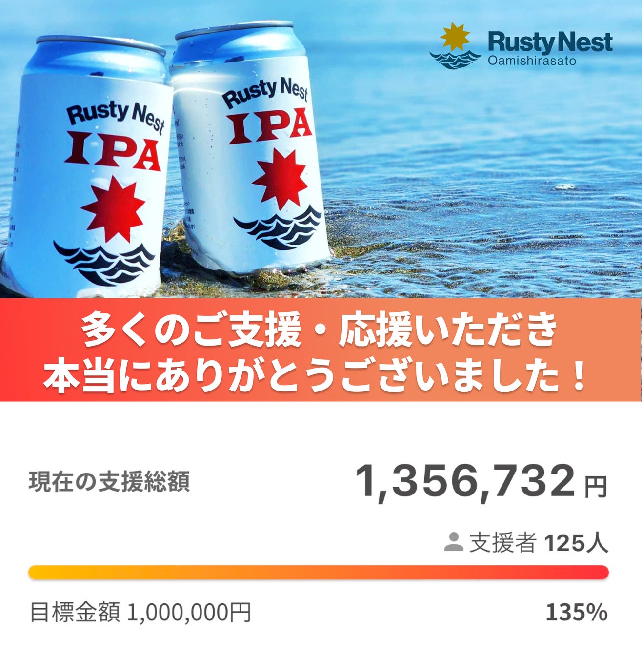 2024年8月1日 (木)から9月30日 (月)の夏の期間、Rusty Nesy Oamishirasatoは、自社醸造所の一部をご支援いただくクラウドファンディングを通じて、125名のご支援者様から130万円以上のご支援をいただき、目標金額100万円を大きく上回り、プロジェクトを完了することができました。