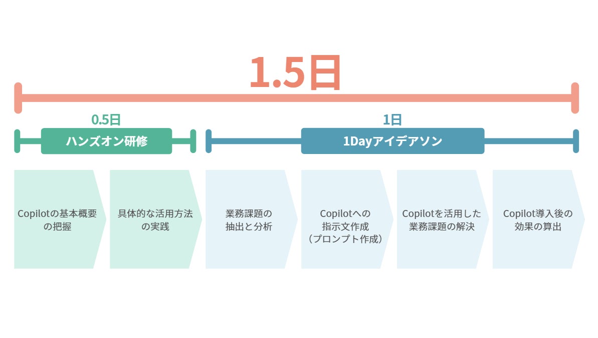 元マイクロソフト社員をはじめとしたプロフェッショナルが伴走し、1.5日という短期間でCopilot導入の利点を明らかにすることで、多くの人員や時間を割くことなく導入の検証を行うことができます。