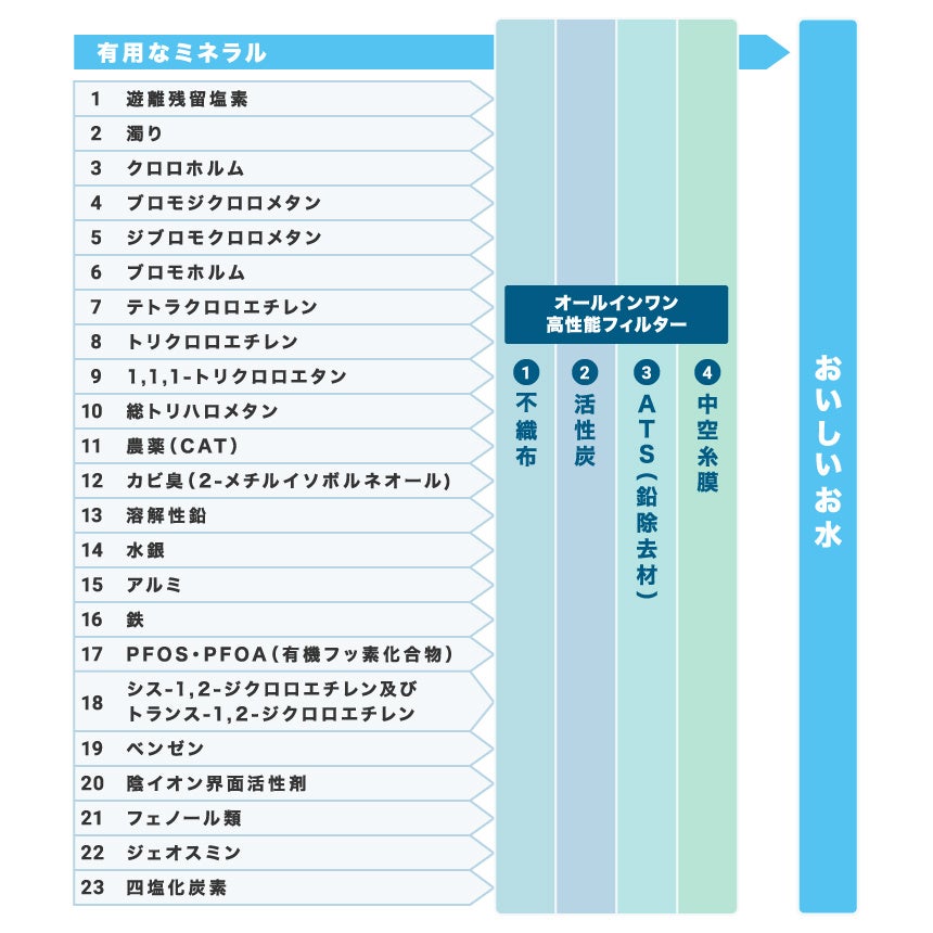 専用カートリッジは、PFAS(有機フッ素化合物)など23種類の不純物をしっかり除去。