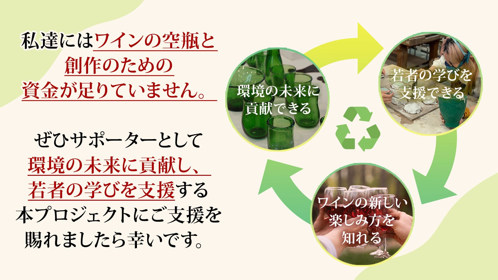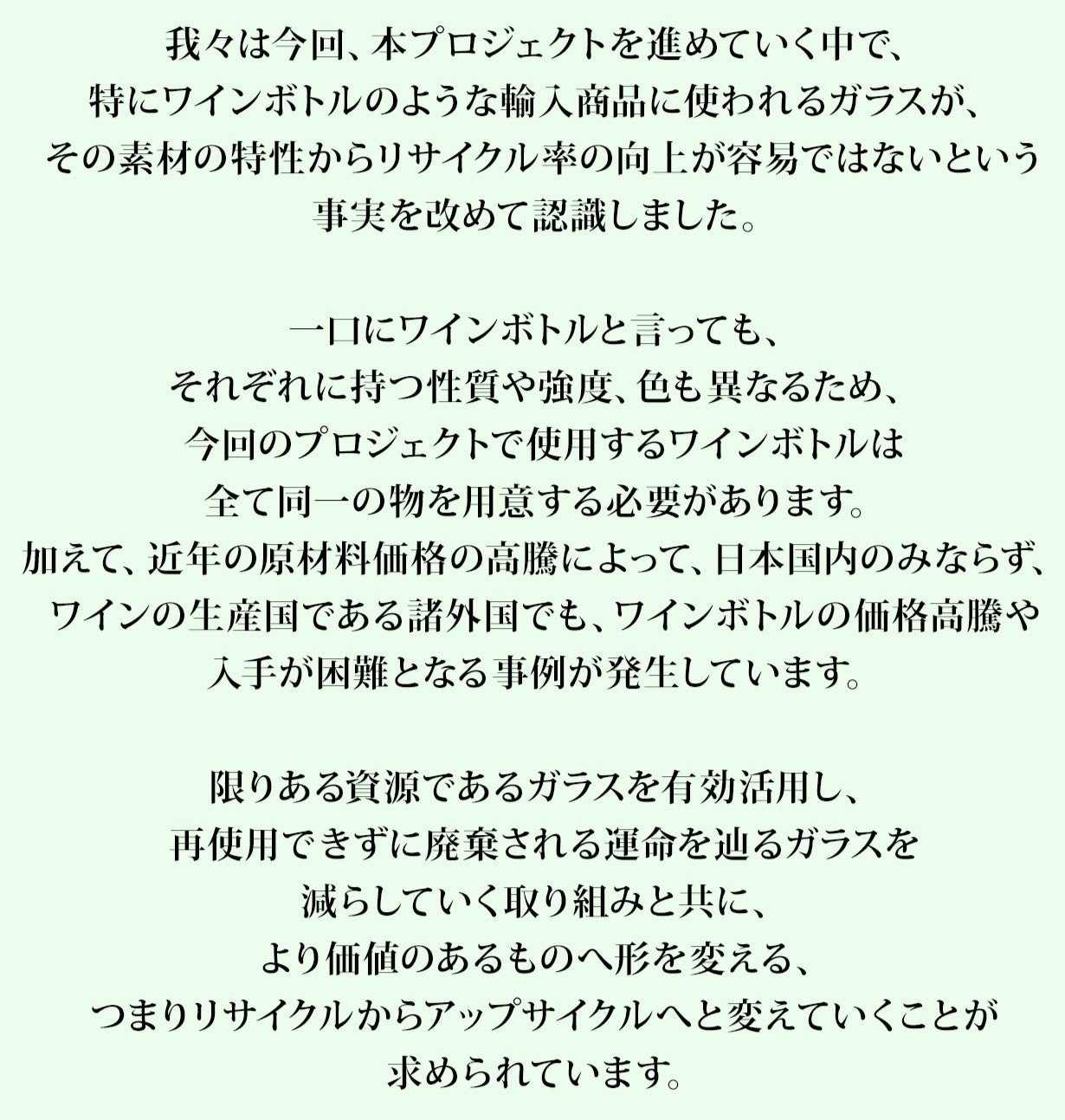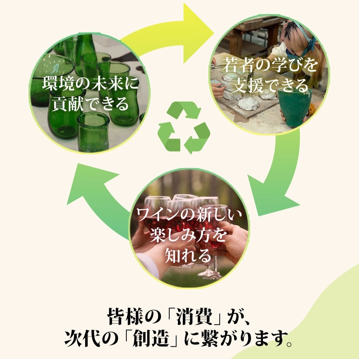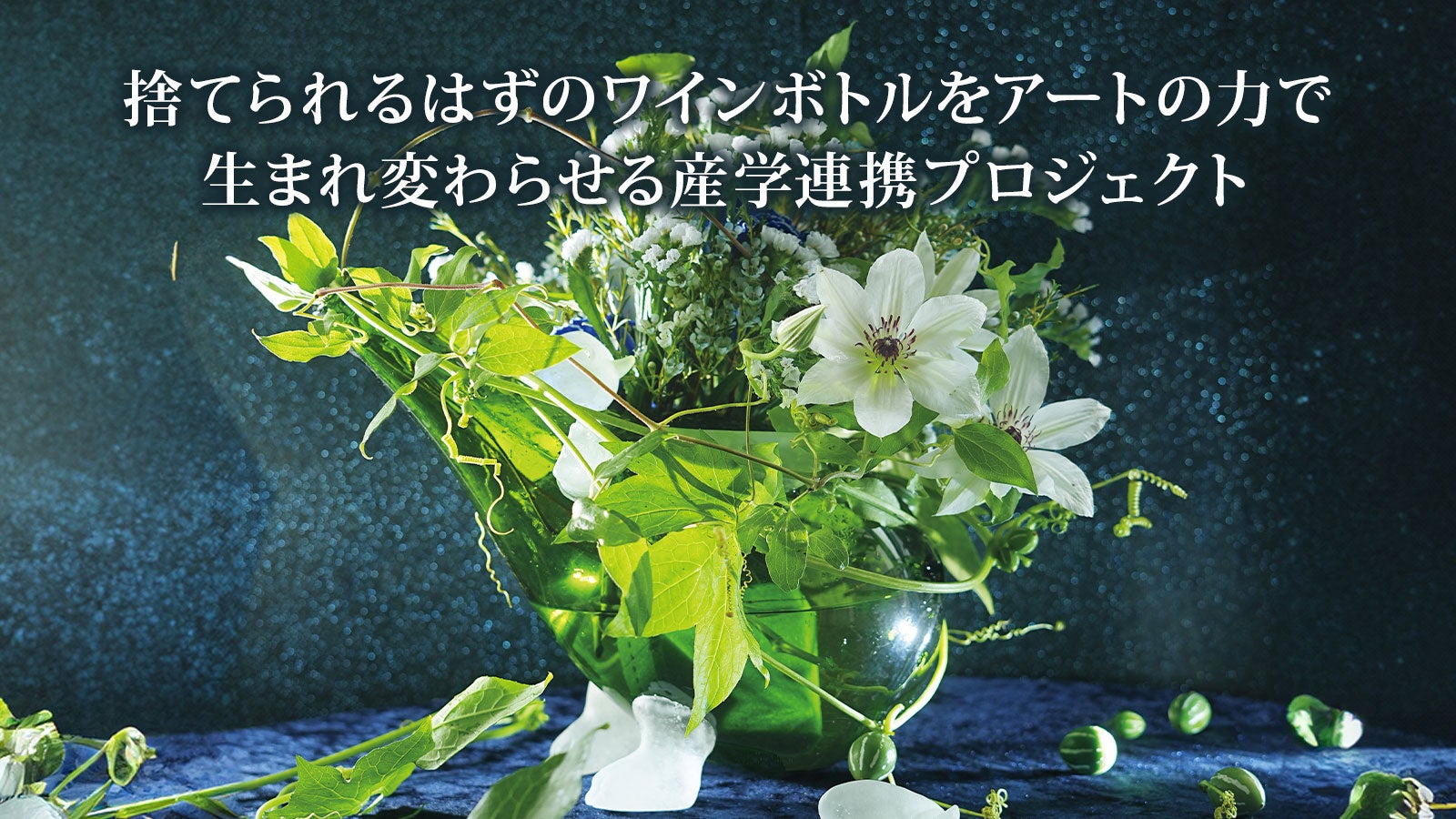 およそ4億7千3百万本ものワインが1年間で消費されている現状。消費量が増えている=廃棄されるボトルも増え続けている。廃棄ボトルをアートの力で甦えらせる「ワインボトル・アップサイクル・プロジェクト」