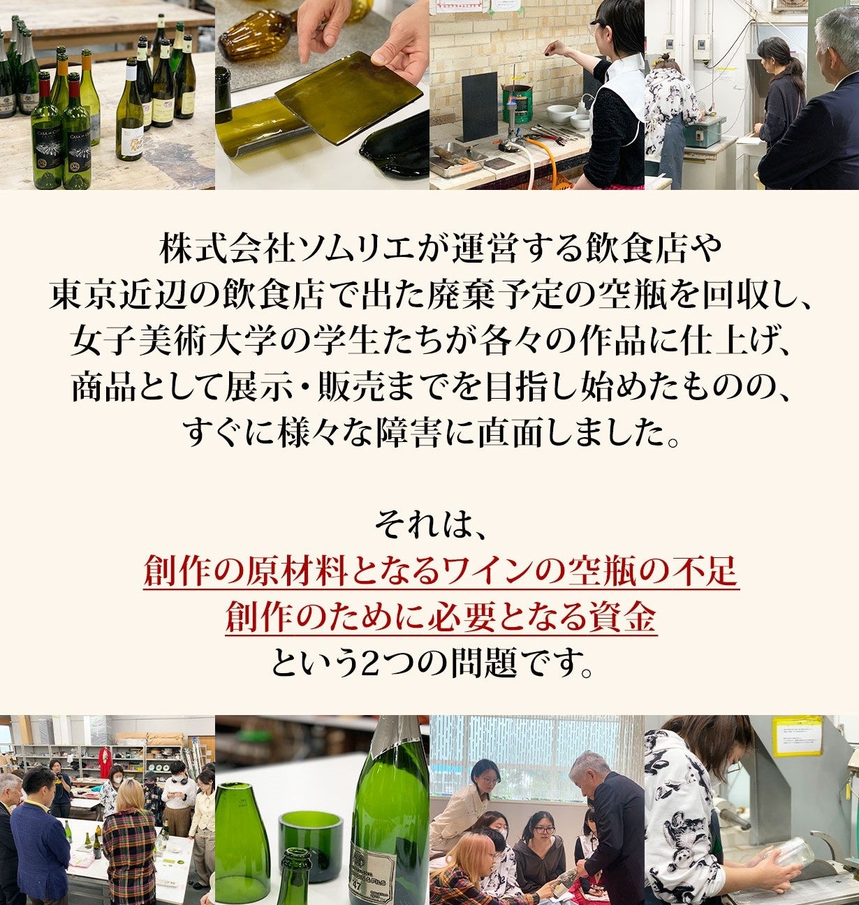 ワインと食の総合ビジネスを展開する株式会社ソムリエ(代表取締役社長 守川敏、以下:当社)は、〈女子美術大学芸術学部デザイン・工芸学科⼯芸専攻ガラス分野〉の学生、〈シャンパーニュメゾン Paul Dangin Et Fils(ポール・ダンジャン・エ・フィス)〉と供に、三者協同で「ワインボトル・アップサイクル・プロジェクト」をクラウドファンディング「Makuake」で展開、プロジェクトに参加いただける公式サポーターの募集を開始します。