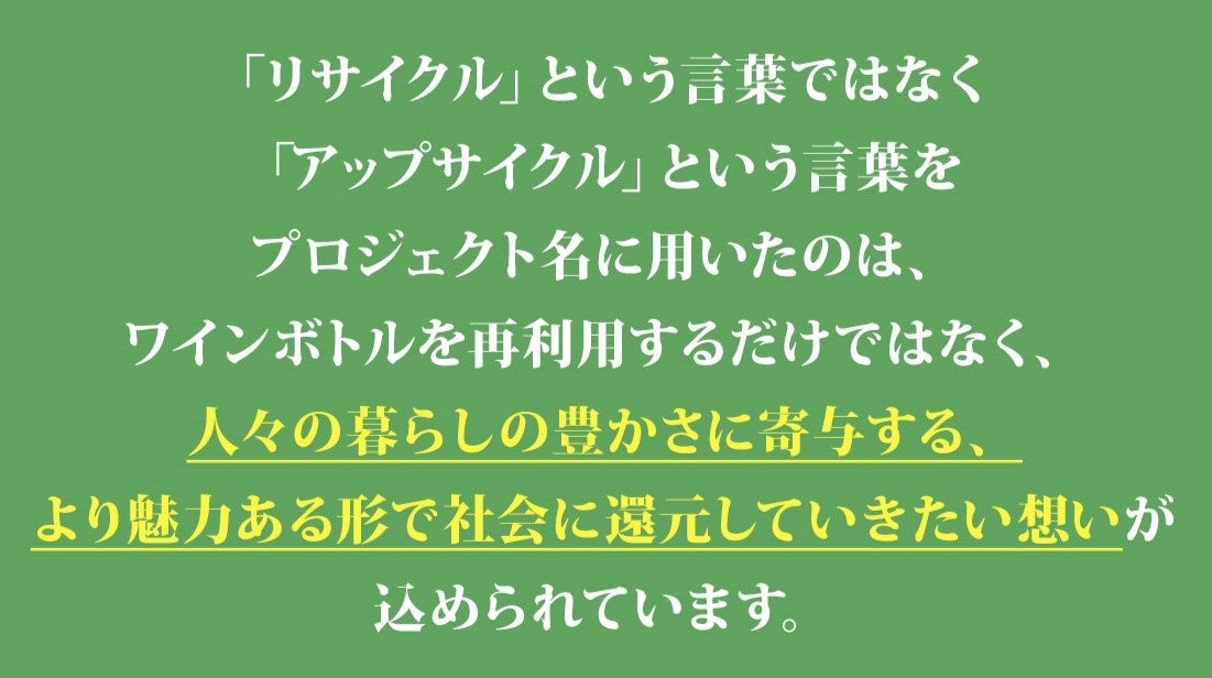 飲み終えたワインボトルをなんとか有効利用できないか、これからも人々が楽しくワインを飲み続けるために果たせる社会的責任はどんなものだろうか、そう考え始めた人々が集い、処分されてしまうワインボトルをアート作品として生まれ変わらせる『ワインボトル・アップサイクル・プロジェクト』が発足しました。