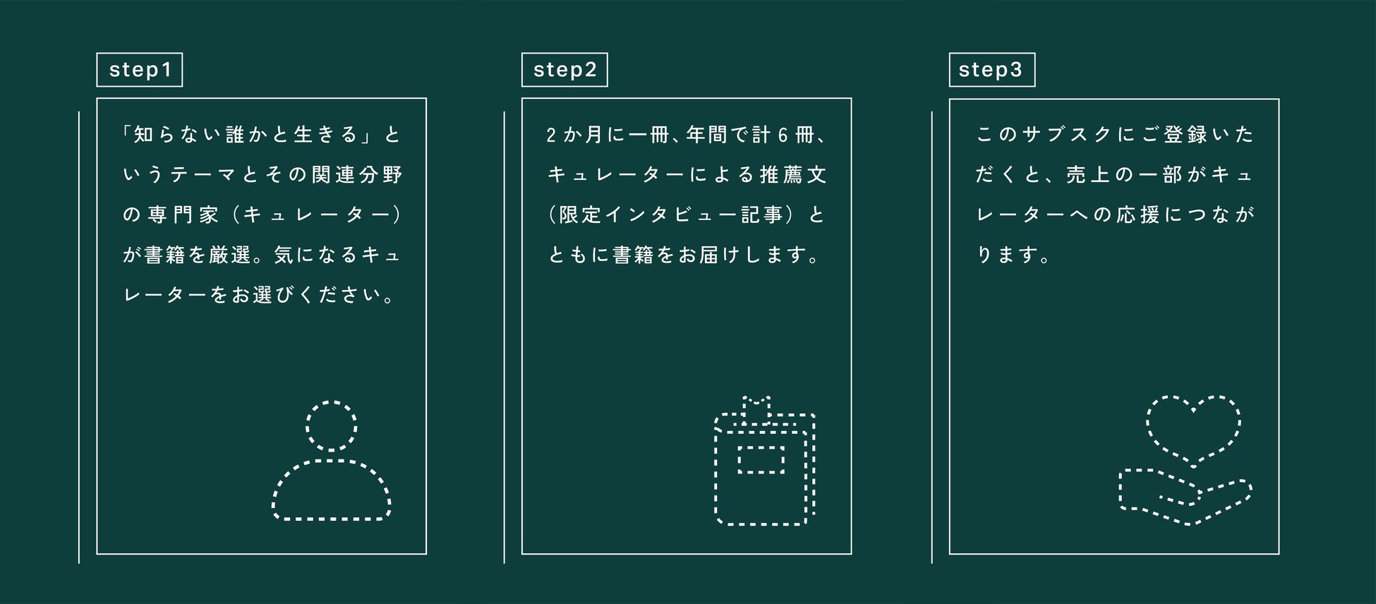 人文学、芸術、社会問題などの分野で活躍する多様なキュレーターたちが、それぞれテーマを掲げて選んだ書籍1冊に、選書への思いや推薦コメントを綴ったオリジナルテキストを添えて、読者のもとへお届けする予定。1年間を通して、最先端のキュレーターの思考を辿ることができる。