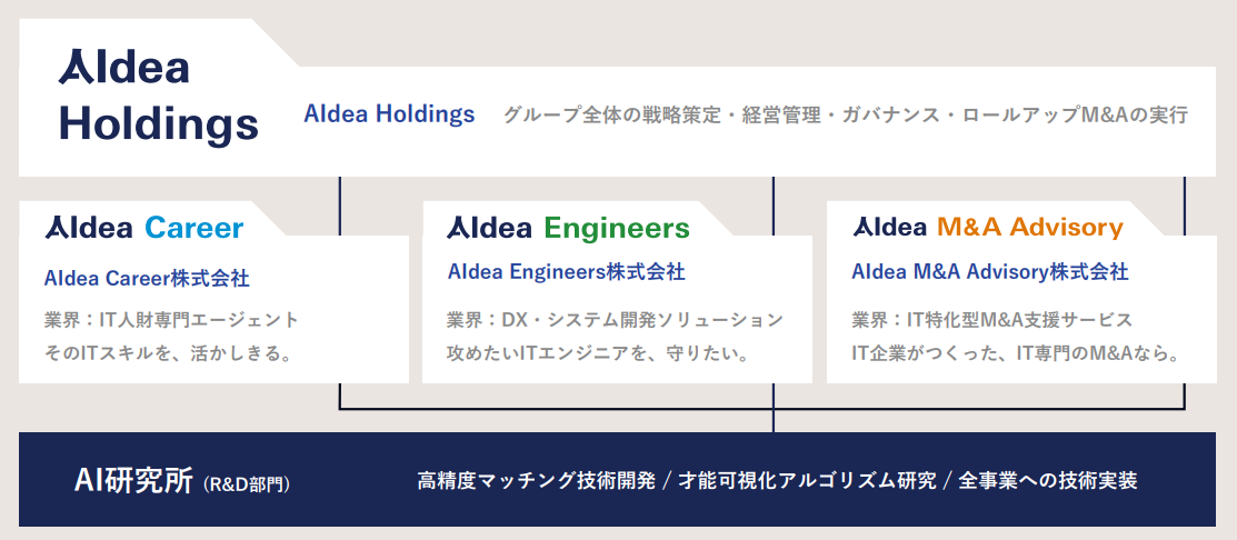 AIdea Holdingsを持株会社として、事業領域ごとに専門性の高いプロフェッショナル集団を配置します。さらに、グループ横断の知見を担うAI研究所が全事業を貫き、データ活用とサービス改善を推進することで、シナジー創出を最大化します。