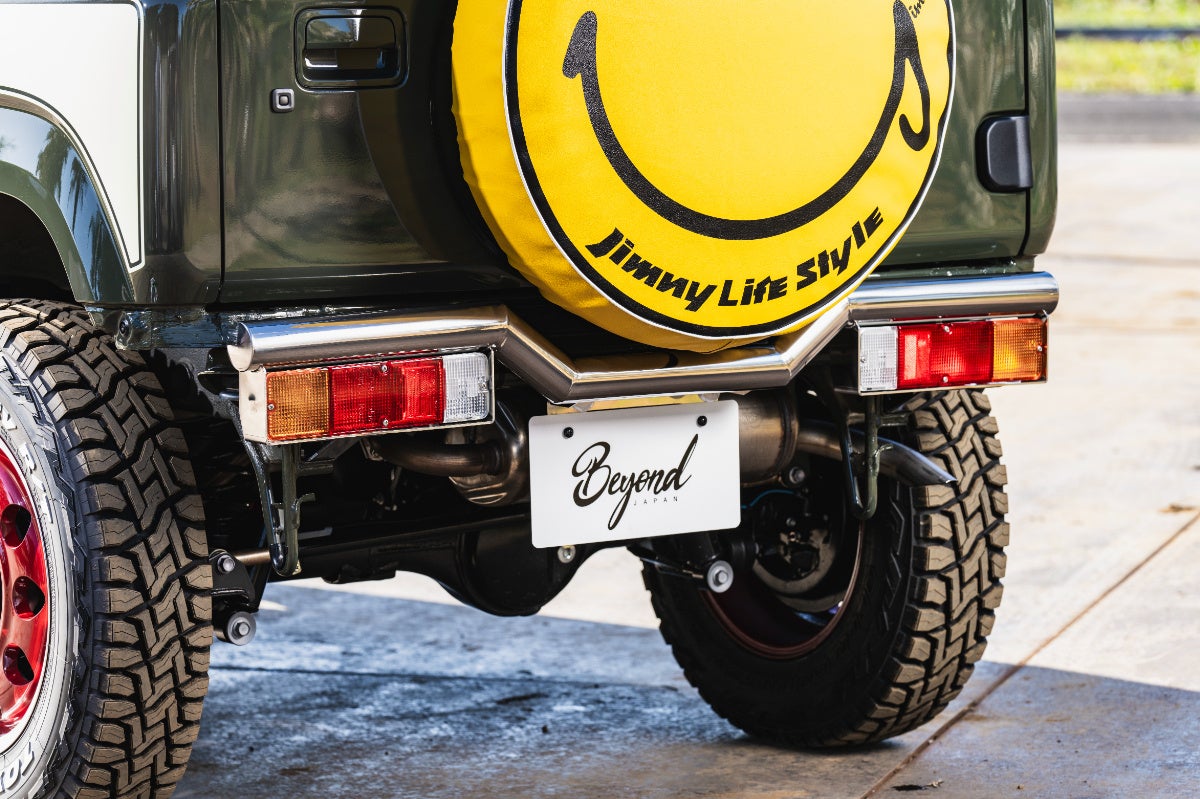 リアバンパーにJA11純正テールランプを採用し、クラシカルなテイストを再現。過去のデザインに敬意を表しつつ、新しい価値を付加しています。リアバンパーのパイプ形状にもこだわり、スペアタイヤとの干渉を避けるためにセンター部分を曲げ、デザイン性と機能性のバランスを追求しました。