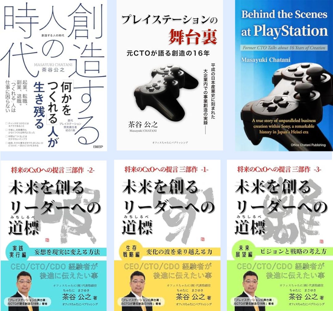 Amazon「取締役会・株主総会・事業継承」カテゴリーで人気ランキング1位となった「創造する人の時代」(日経BP刊)著者。プレイステーション事業立ち上げの経験を実録の形でまとめた「プレイステーションの舞台裏:元CTOが語る創造の16年」(オフィスちゃたにパブリッシング)とその英語版 "Behind the Scenes at PlayStation: Former CTO Talks about 16 Years of Creation" (Office Chatani Publishing)、次世代のCxOに向けた提言として「未来を創るリーダーへの道標」3部作 生存戦略編・実践実行編・未来展望編を世界15の Amazon ストアで発売中。