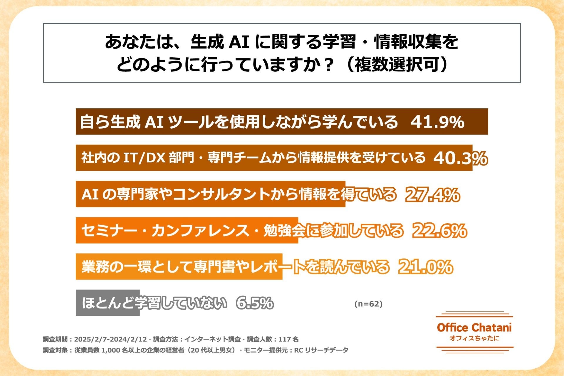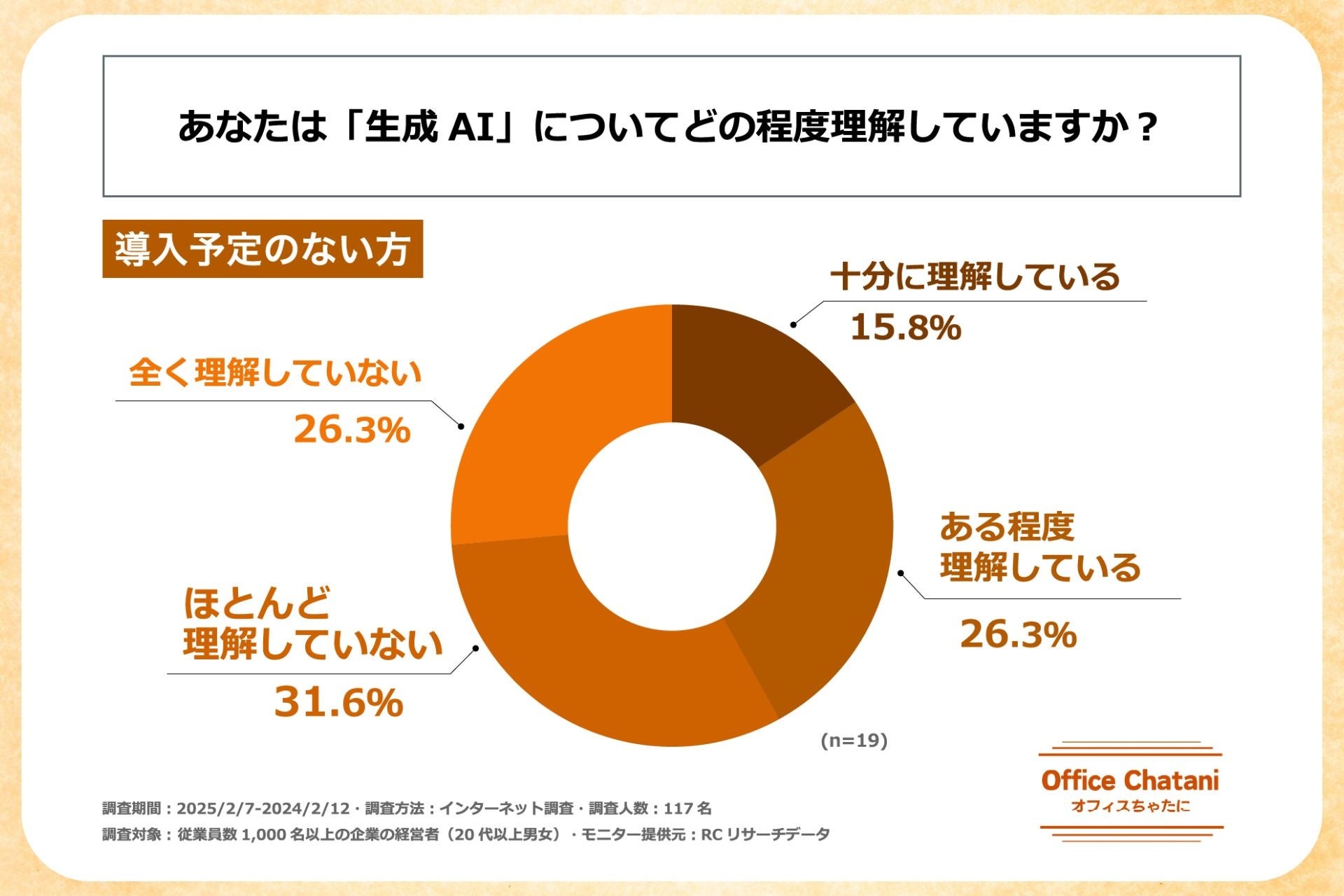 オフィスちゃたに株式会社(代表取締役 茶谷 公之)は、従業員数1,000名以上の企業の経営者を対象に「大手企業における生成AI導入の実態と経営層のAIリテラシー」に関する調査を実施しました。本調査により、大手企業の生成AI導入状況と経営層の生成AIに対するリテラシーの実態が明らかとなりました。