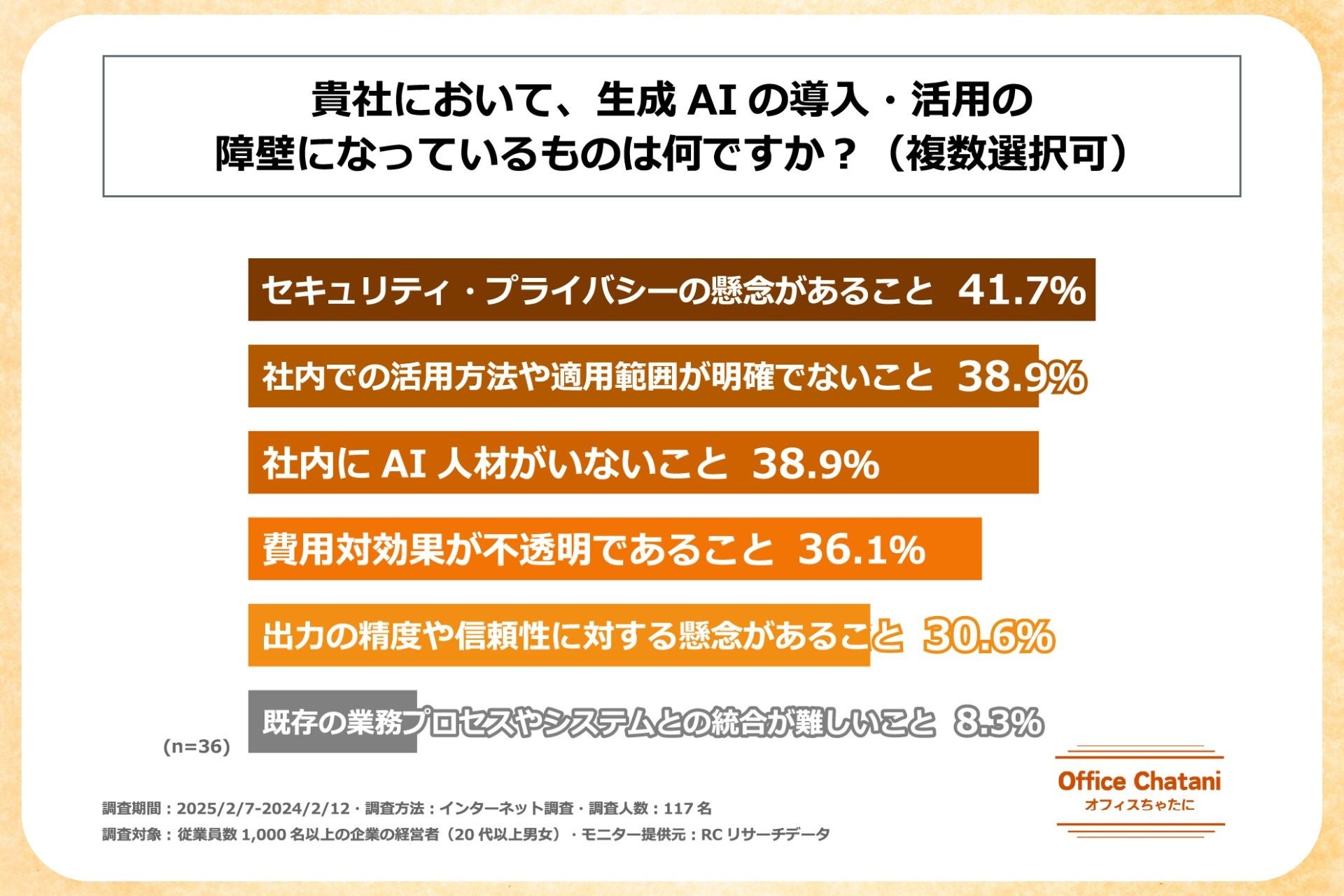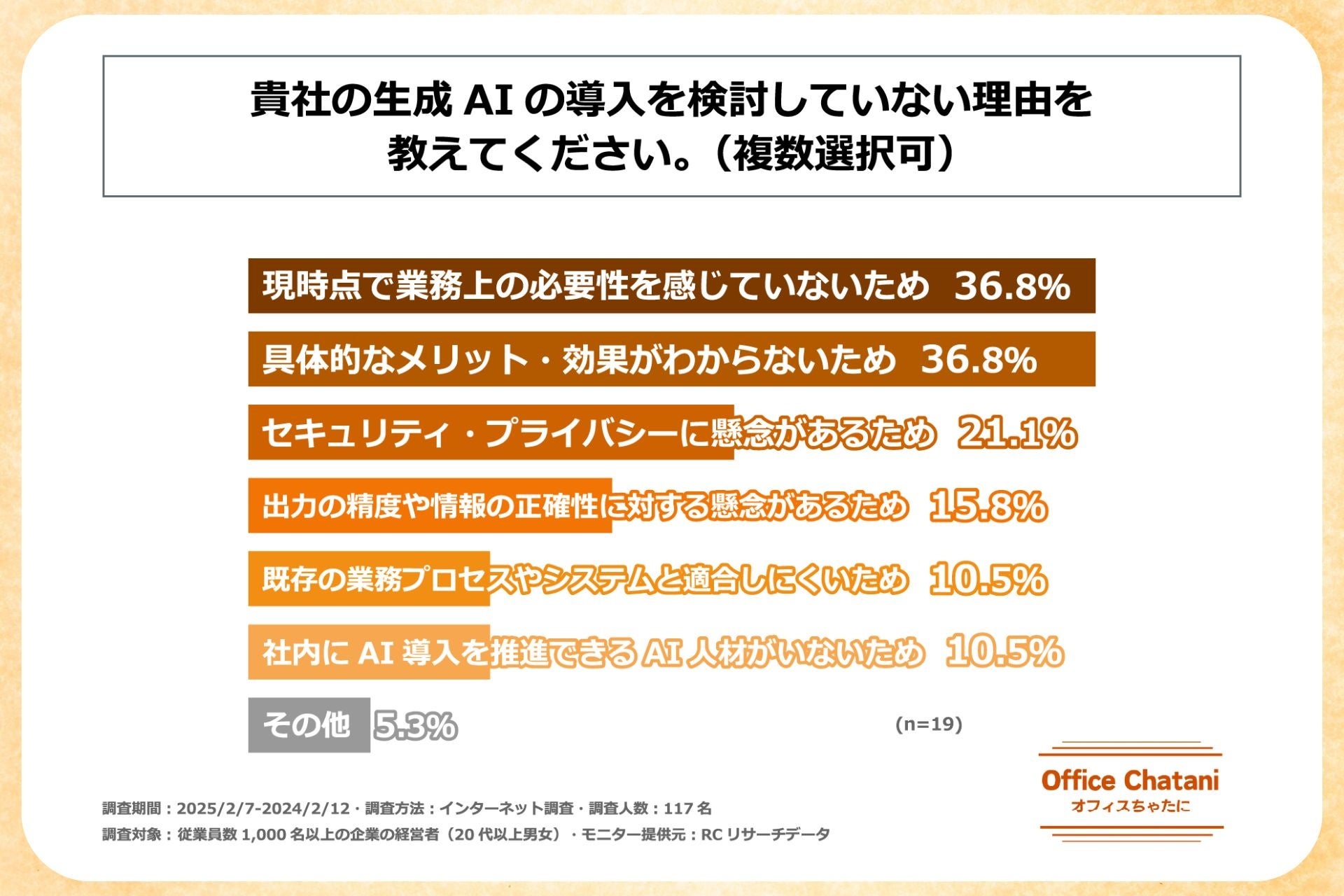 調査の最後に、生成AIの導入予定がないと回答した経営者に対し、「生成AIの導入を検討していない理由」を尋ねたところ、1位は同率で「現時点で業務上の必要性を感じていないため」と「具体的なメリット・効果がわからないため」(各36.8%)、3位は「セキュリティ・プライバシーに懸念があるため」(21.1%)という結果になりました。この設問では、セキュリティ・プライバシーの問題よりも、業務上の必要性や具体的なメリット・効果が見えないことが、導入検討の阻害要因としてより大きく影響していることが示されました。