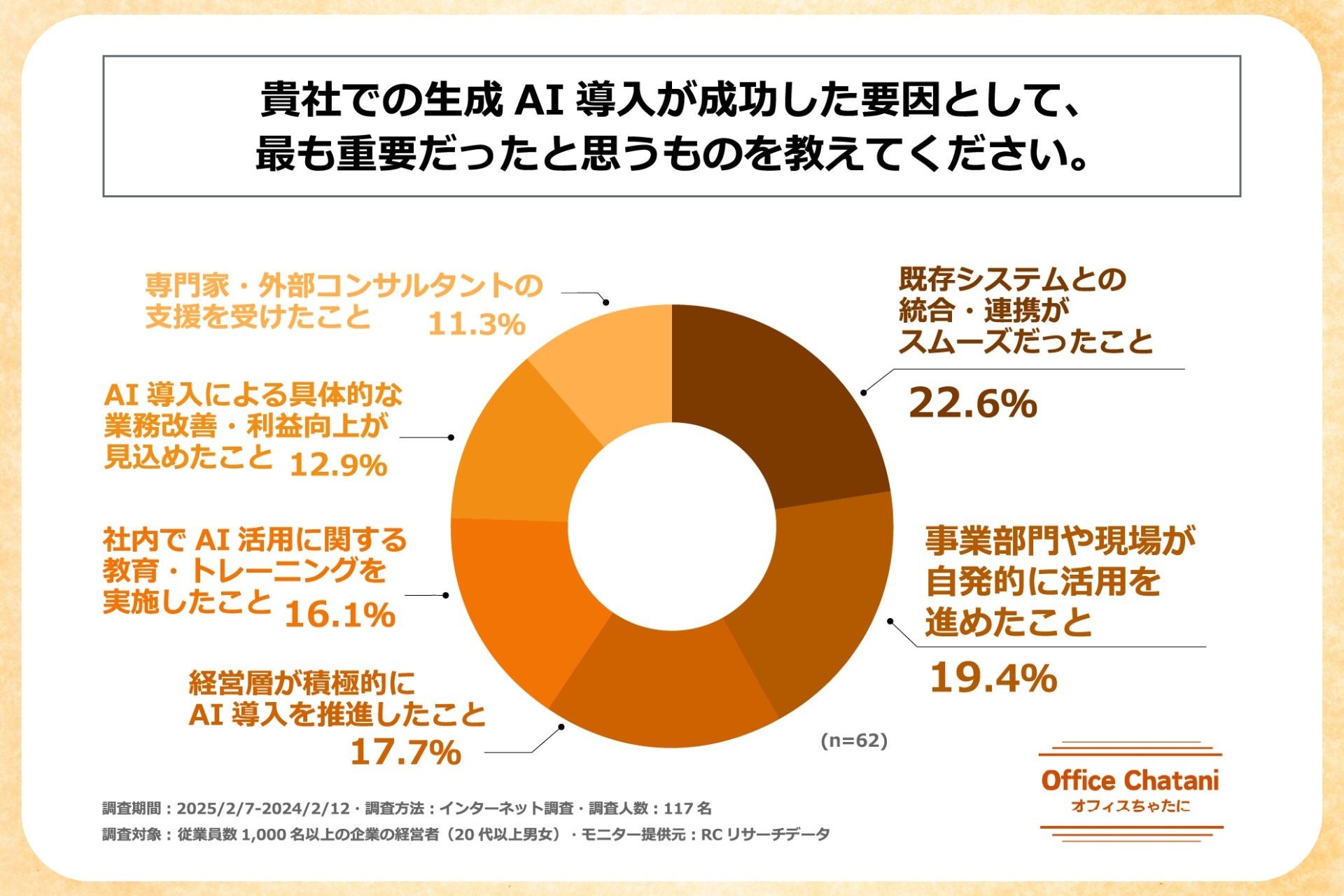 生成AI導入の成功要因として、社内既存システムとの親和性や、現場と経営層双方の前向きな取り組み姿勢が大きく寄与していることが明らかに