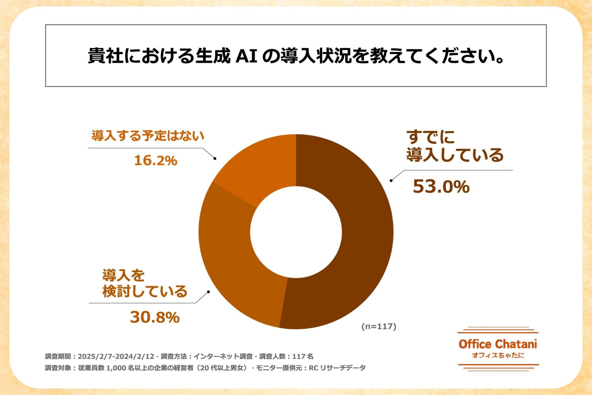 その要因として、技術的な課題に加え、最終決定権を持つ経営者の理解度が大きく影響していると考えられます。こうした背景を踏まえ、オフィスちゃたに株式会社は、従業員1,000名以上を有する大手企業の経営者を対象に、「大手企業における生成AI導入の実態と経営者のAIリテラシー」に関する調査を実施しました。