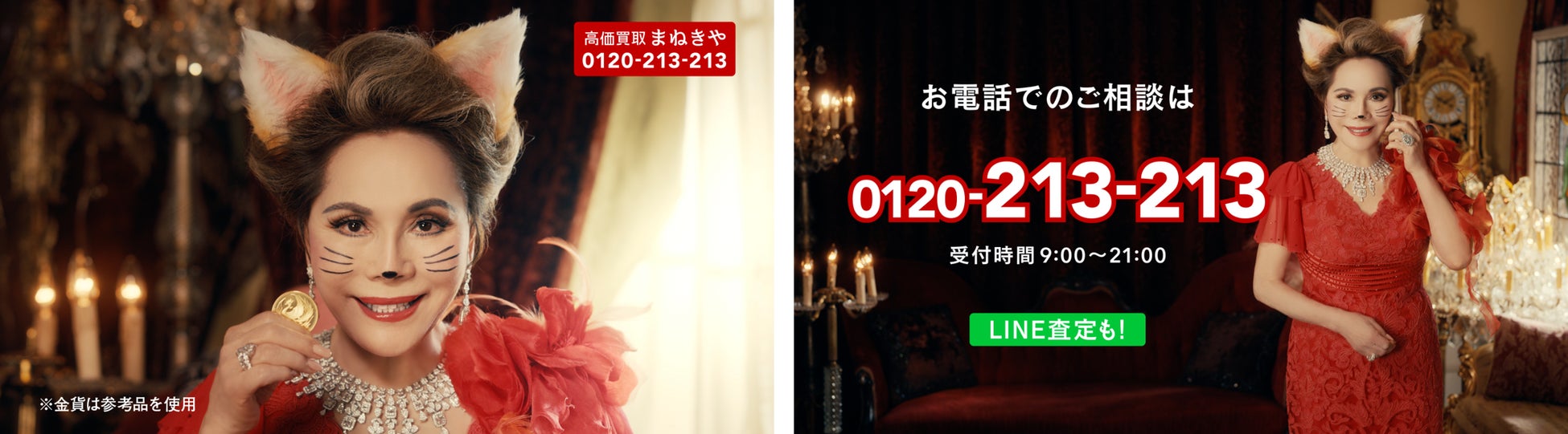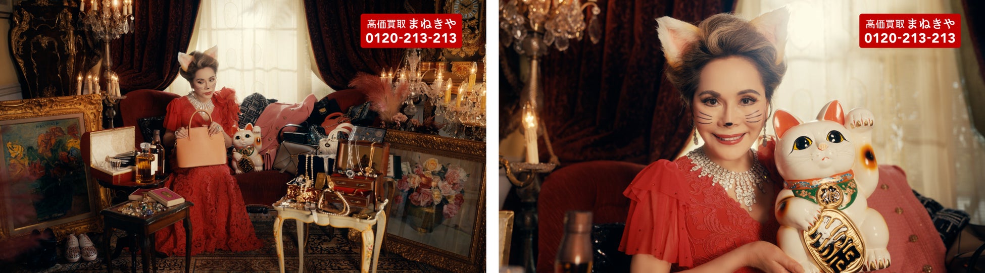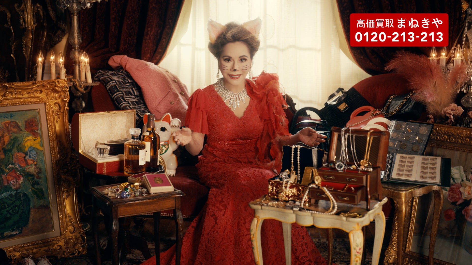 「高価買取ならまねきや」篇は、もふもふの猫の手をはめ、猫に扮したデヴィ夫人が「これ、売っちゃおうかしら?」と金や宝石に囲まれながら悩む様子で始まります。「そう思ったら『まねきや』!」と言いながら、白いまねき猫を持ち上げ、金や宝石、十万円金貨まで「まねきや」で売れるとコメント。最後は「高値で売らなきゃもったいニャイ!」という可愛らしい猫語の一言で締めくくられます。