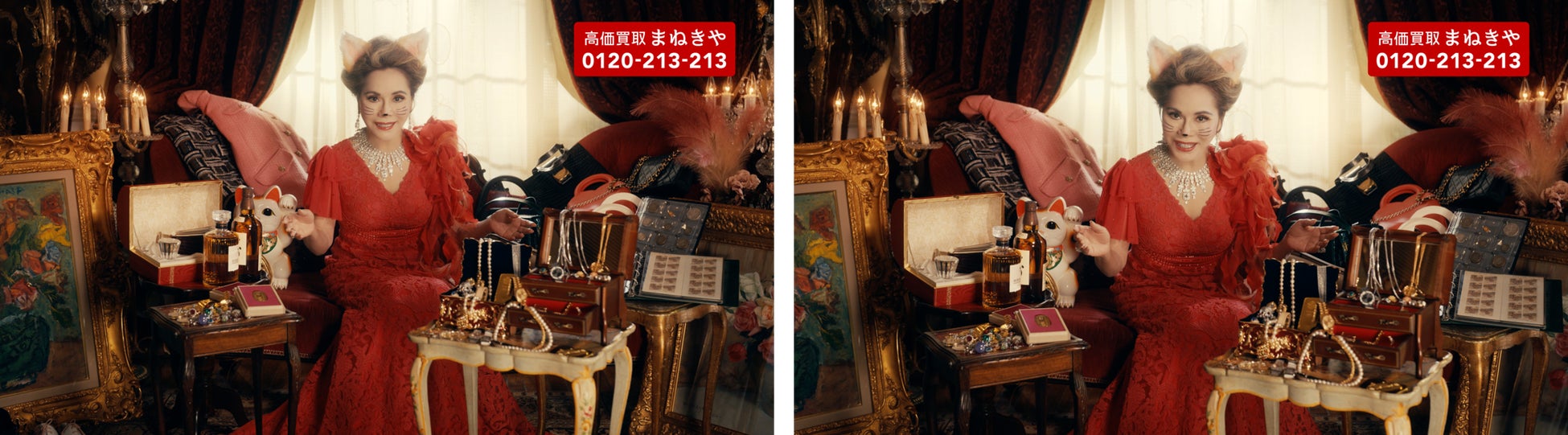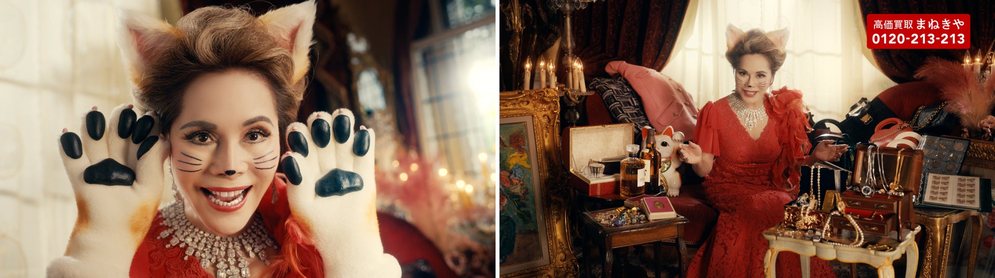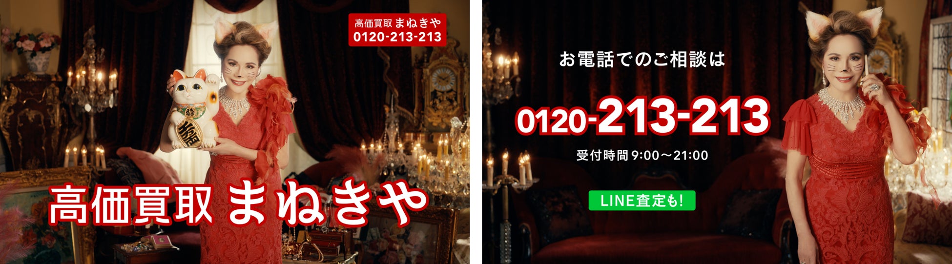 「高価買取ならまねきや」篇は、もふもふの猫の手をはめ、猫に扮したデヴィ夫人が「これ、売っちゃおうかしら?」と金や宝石に囲まれながら悩む様子で始まります。「そう思ったら『まねきや』!」と言いながら、白いまねき猫を持ち上げ、金や宝石、十万円金貨まで「まねきや」で売れるとコメント。最後は「高値で売らなきゃもったいニャイ!」という可愛らしい猫語の一言で締めくくられます。