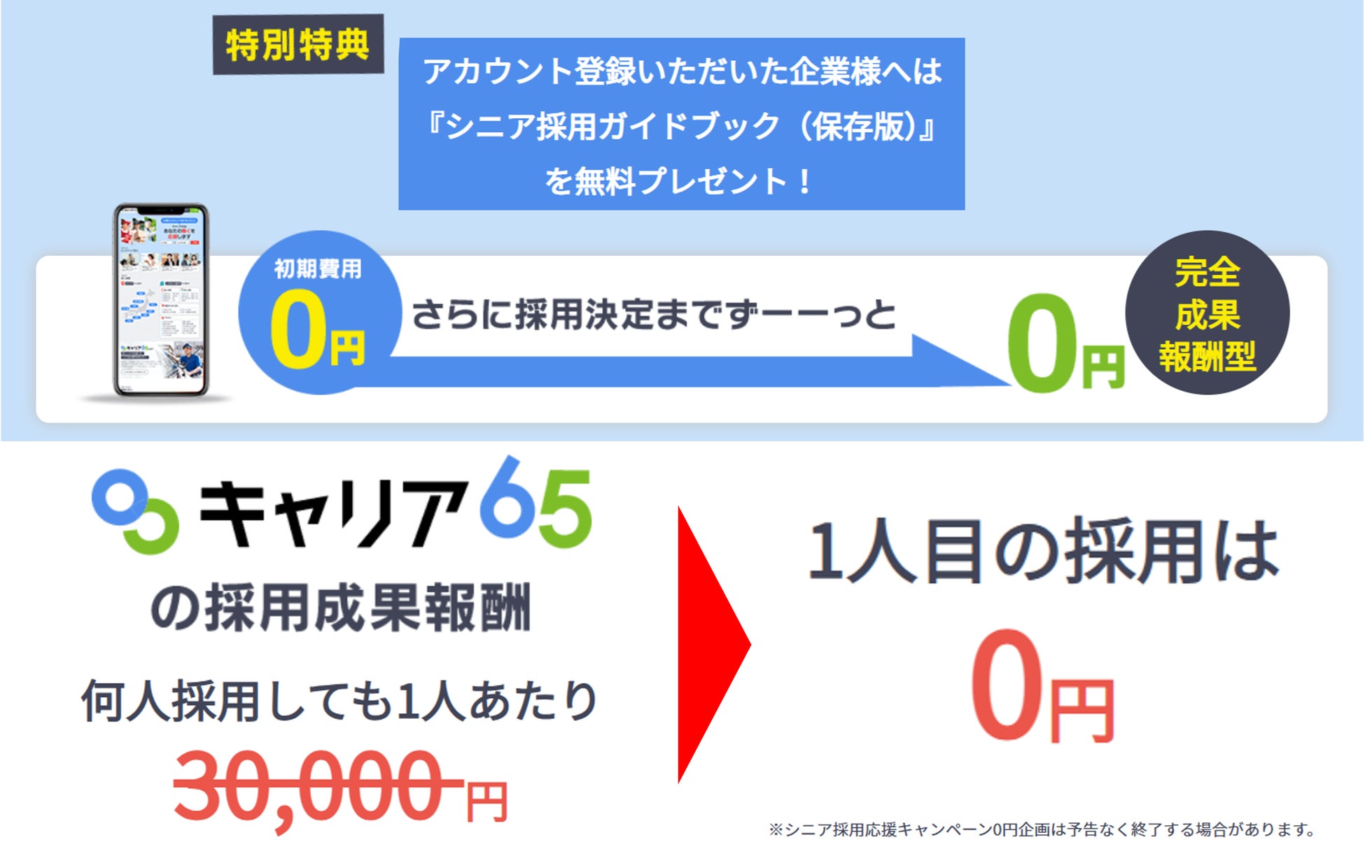 『キャリア65』ではこの課題を解消するため、「最初の1名の採用費用を無料」とし、さらにそれ以降も「採用が決まった時点でのみ費用が発生する完全成果報酬型」の仕組みを導入しました。