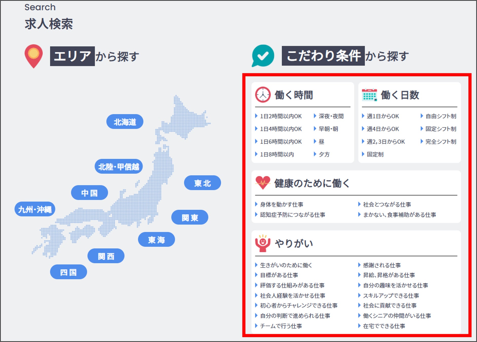 求職者は、「体を動かす仕事」「認知症予防につながる仕事」「社会とつながる仕事」など、健康状態や目的に合わせて求人を探せる設計になっています。