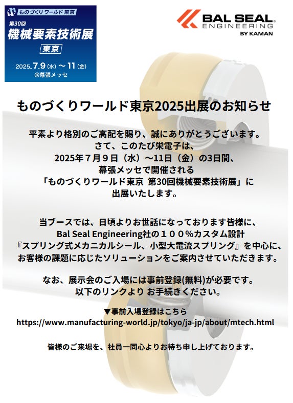栄電子は、創業以来、電子部品・電子デバイスの総合商社として、新しい商材の発掘や商流・顧客の開拓、安定供給に努め、「お客の役に立て」という使命を実践して参りました。今回は一昨年より正規代理店となったBal Seal Engineering社の展示ブースを設けました。