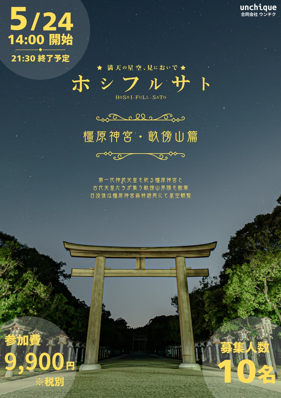 アストロツーリズムのイベント企画・運営を行っている合同会社ウンチク(本社:奈良県奈良市、代表社員:太田原 章巨)は、 橿原神宮と畝傍山を会場とした「ホシフルサト ー橿原神宮・畝傍山篇ー」を2025年5月5月24日(土)に開催いたします。