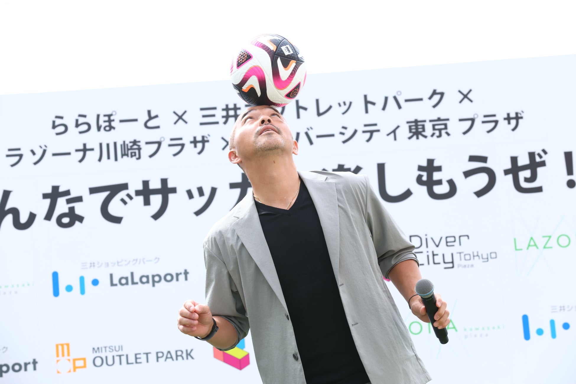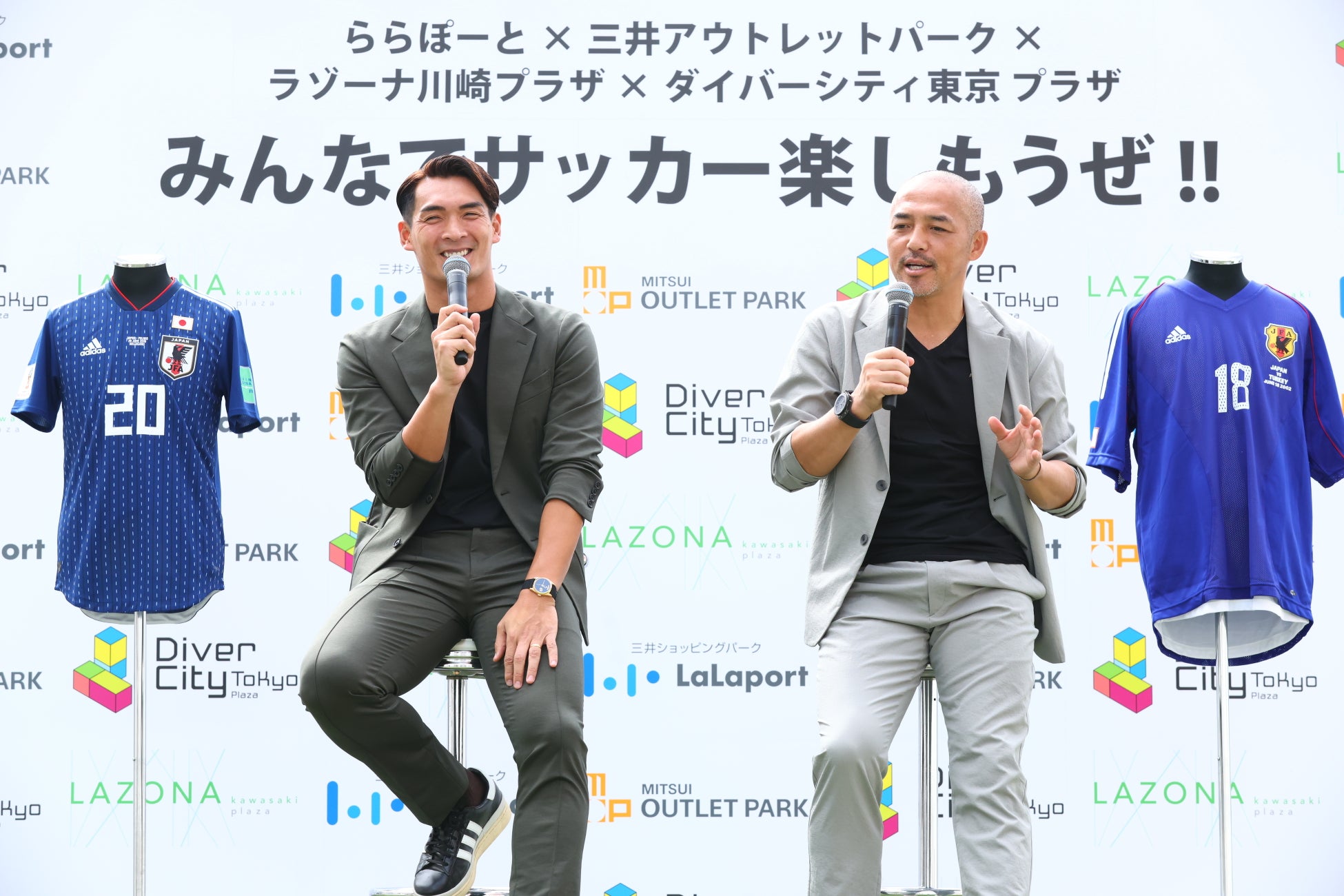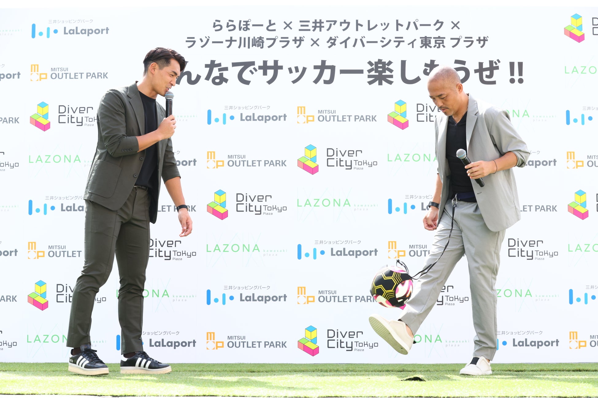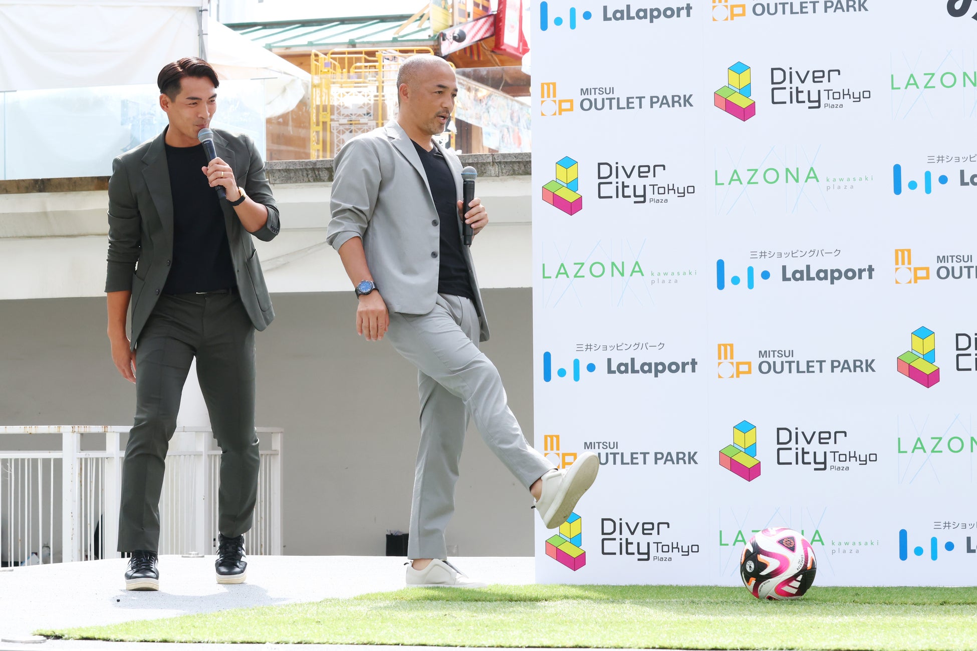 これに先立ち、2024年10月1日(火)にアーバンドック ららぽーと豊洲にて「みんなでサッカー楽しもうぜ!」プロモーションイベントを開催いたしました。当日は、小野伸二さんと槙野智章さんに、サッカーにかける想いや今のサッカー日本代表についてのトークを繰り広げるトークセッションにご参加いただいたほか、全国32施設でお客さまにも体験いただけるリフティングチャレンジ、ミニフットゴルフに挑戦していただき、会場を盛り上げていただきました。