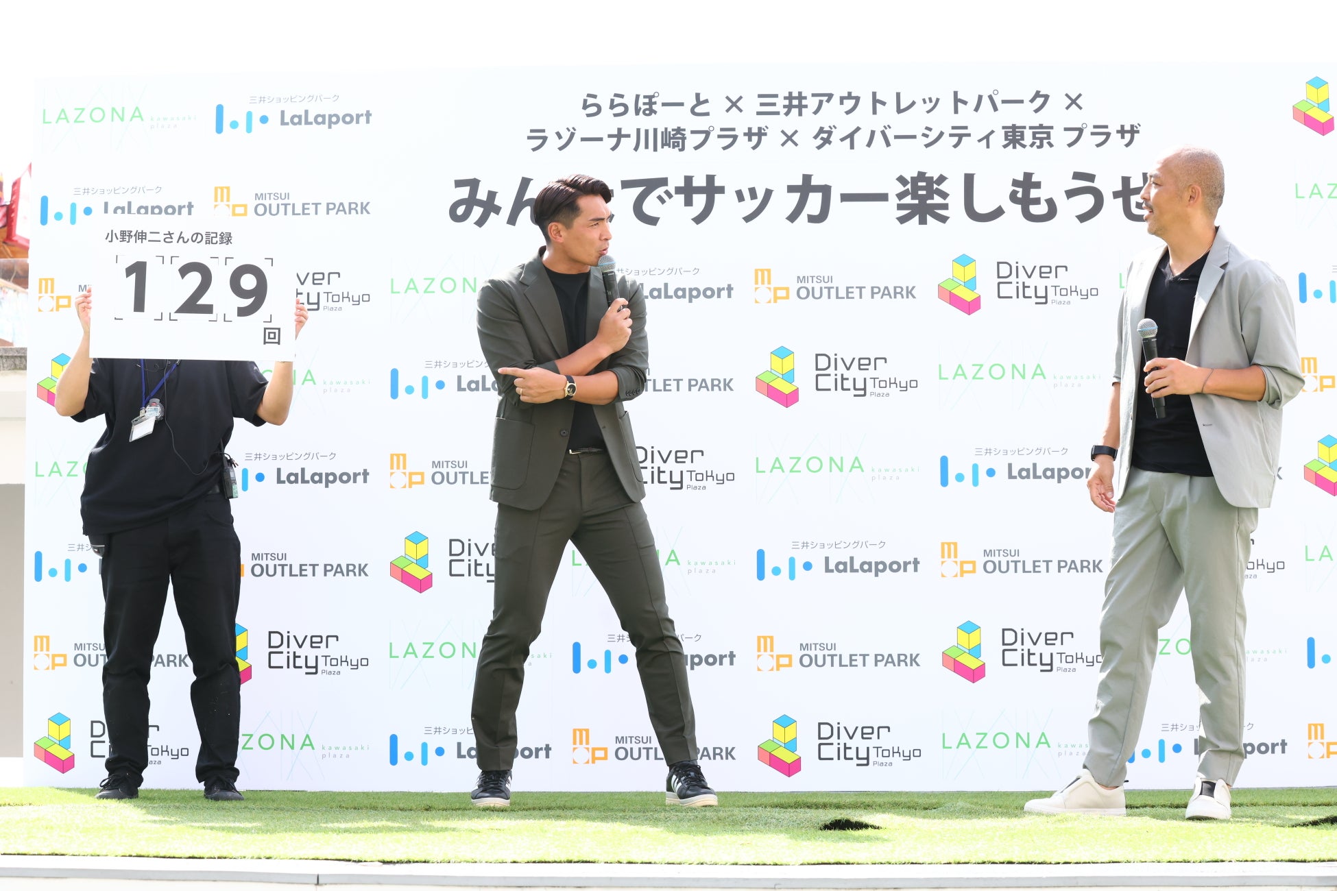 続いて、施設で行われるイベントと同様のルールでベルトを着用し、1分間で何回リフティングができるかのリフティングチャレンジに挑戦した小野さん。全国32の三井不動産グループの商業施設で行われるイベントでは、来場者のみなさまが今回の小野さんの記録に挑戦することとなるため、小野さんも真剣な様子がうかがえました。MCのスタートの笛の音と同時に真剣な表情でリフティングを始めた小野さんは、結果129回という数字をたたき出しつつ、魅せるパフォーマンスで会場を大いに盛り上げました。最後に、リフティングチャレンジに挑戦する方に向けて、コツについて問われると小野さんは「つま先でボールの中心を蹴る。」と回答。初心者から経験者、子どもから大人まで参加ができるリフティングチャレンジに挑戦されるみなさまにエールを送りました。