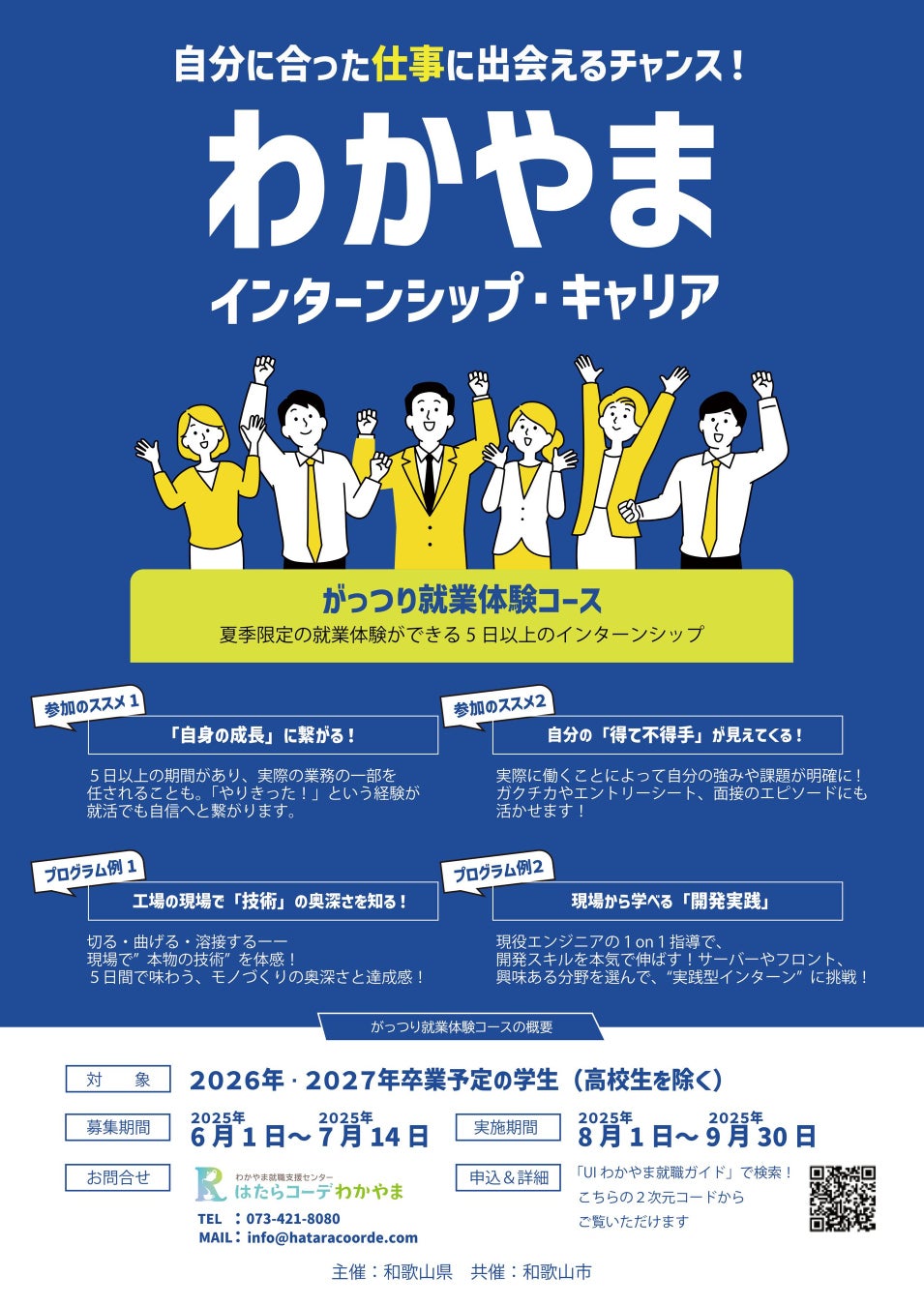 和歌山県が主催する「わかやまインターンシップ・キャリア」では、学生向けインターンシップ参加者の募集を開始しました。本事業では、県内企業での就業体験やオープンカンパニー・企業説明会を通じて、学生が”働く”を自分ごととして捉え、将来のキャリアを考えるきっかけづくりをサポートいたします。