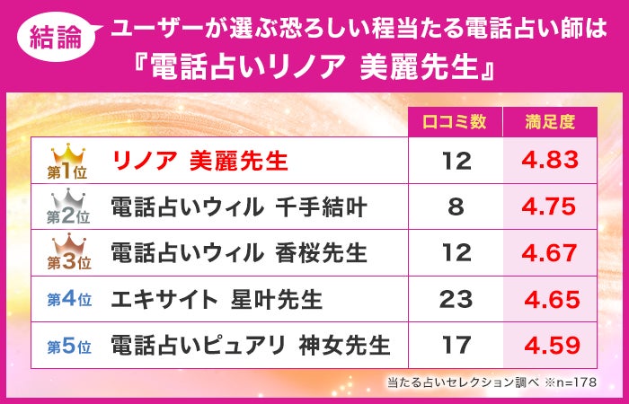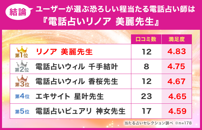 最後に結論として、電話占いユーザーが選ぶおすすめの電話占いの先生をお伝えしていきます。電話占いで恐ろしい程当たる先生に相談した178名の独自アンケートの中でも、口コミ数と満足度評価をベースに厳選した電話占い師ランキングは画像の通りです。