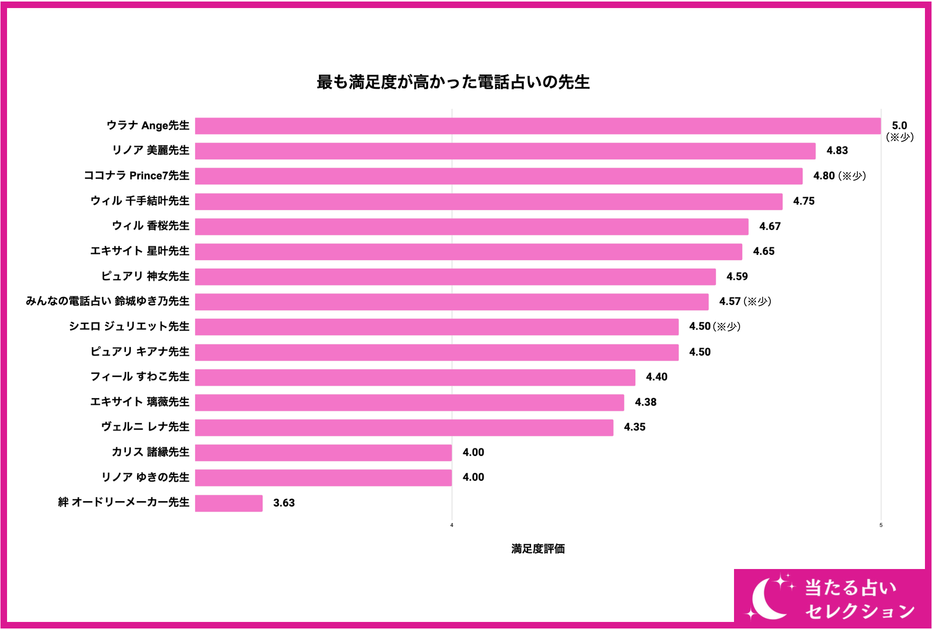 178名の独自アンケートの結果、ユーザーが選ぶ恐ろしい程当たる先生第1位は「リノア 美麗先生」となりました。満足度評価「4.83/5.00」とユーザーからの評価が高く、『美麗先生』の占い師の実力が高いことを証明していると言えるでしょう。