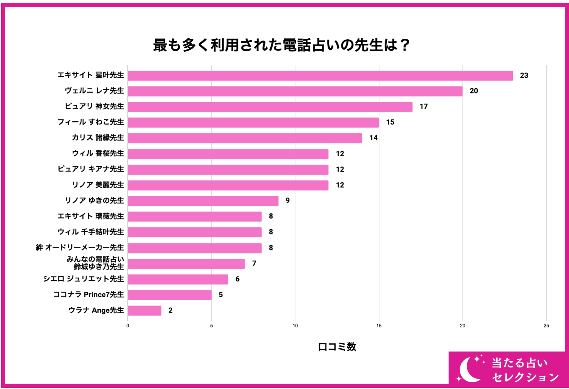 続いて、178名の利用者のうち最も多く利用された電話占いの先生をご紹介していきます。結論から言うと、『エキサイト 星叶先生』や『ヴェルニ レナ先生』、『ピュアリ 神女先生』といった有名な先生が上位となりました。やはり人気の先生は色々な記事や特集で見ることも多く、認知度や知名度が高いため、利用者数も多くなっています。さらに、大手の電話占いほど初回特典やキャンペーンなども豊富で、お得に占ってもらいやすいことも人気の理由と言えるでしょう。